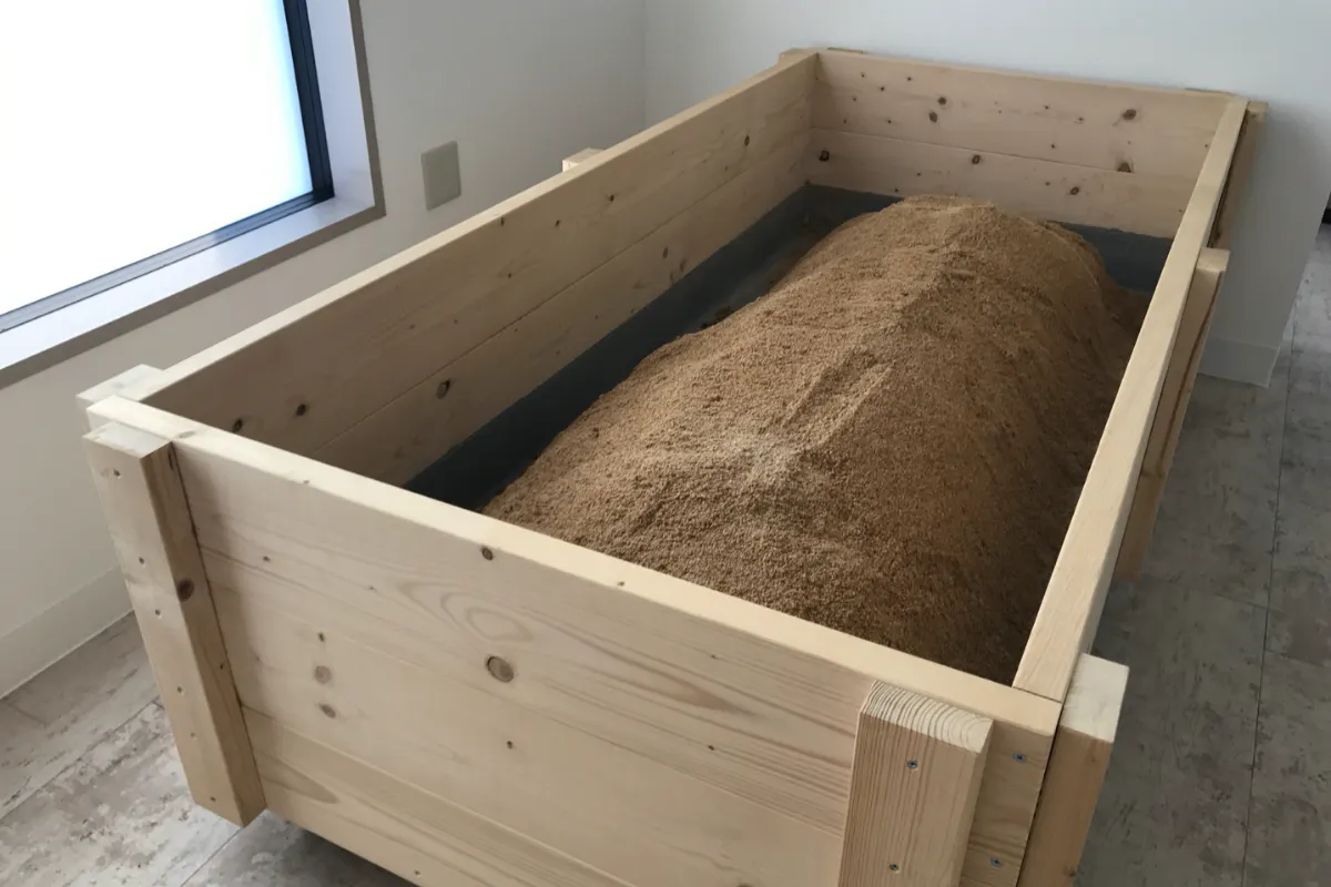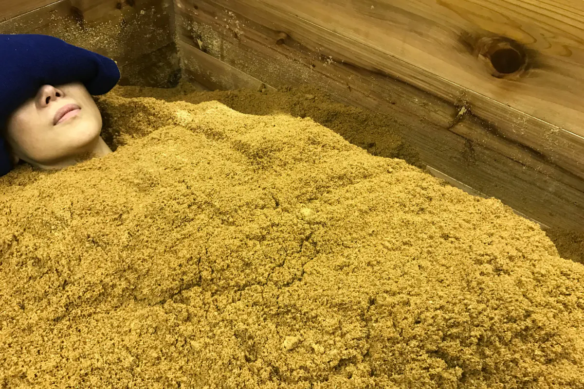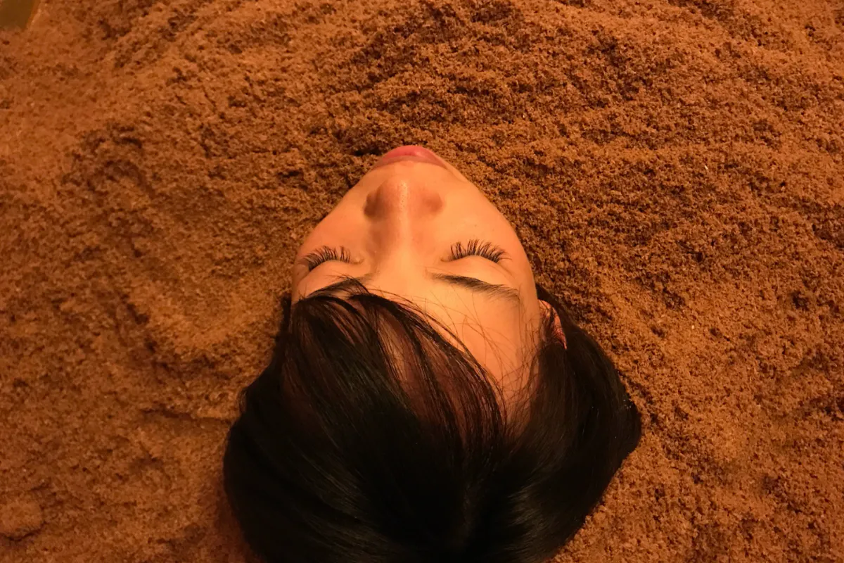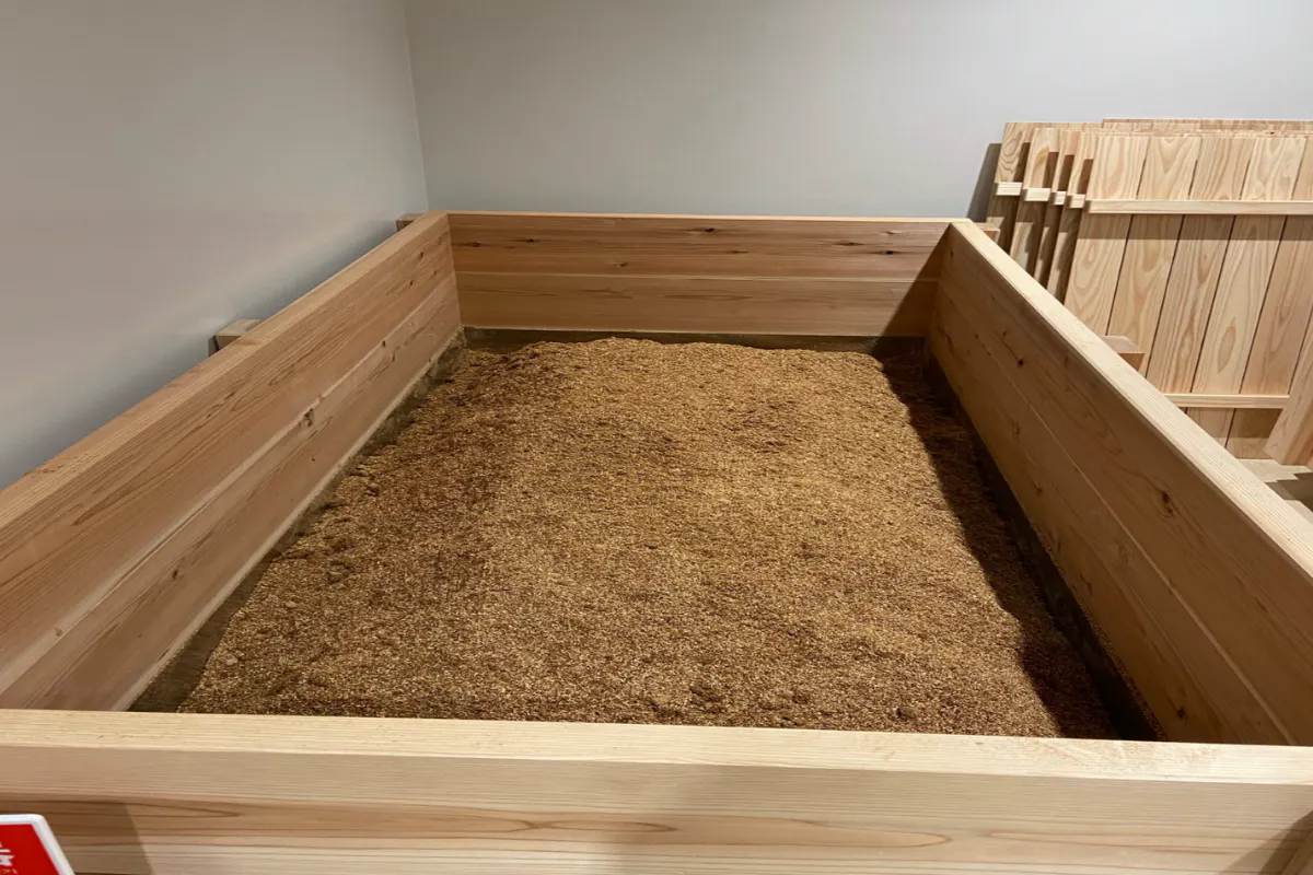 この酵素風呂とは、【ひのきのおが粉】と【米ぬか】をブレンドし、そこに【酵素の菌】を入れ発酵させたものです。土俵のように盛られた米ぬかの山の中に身体をうずめて全身を温めます。