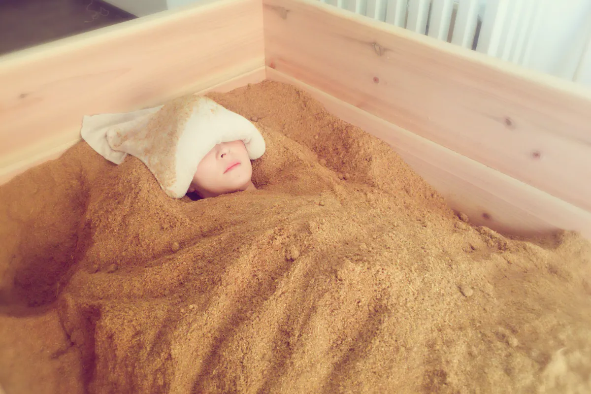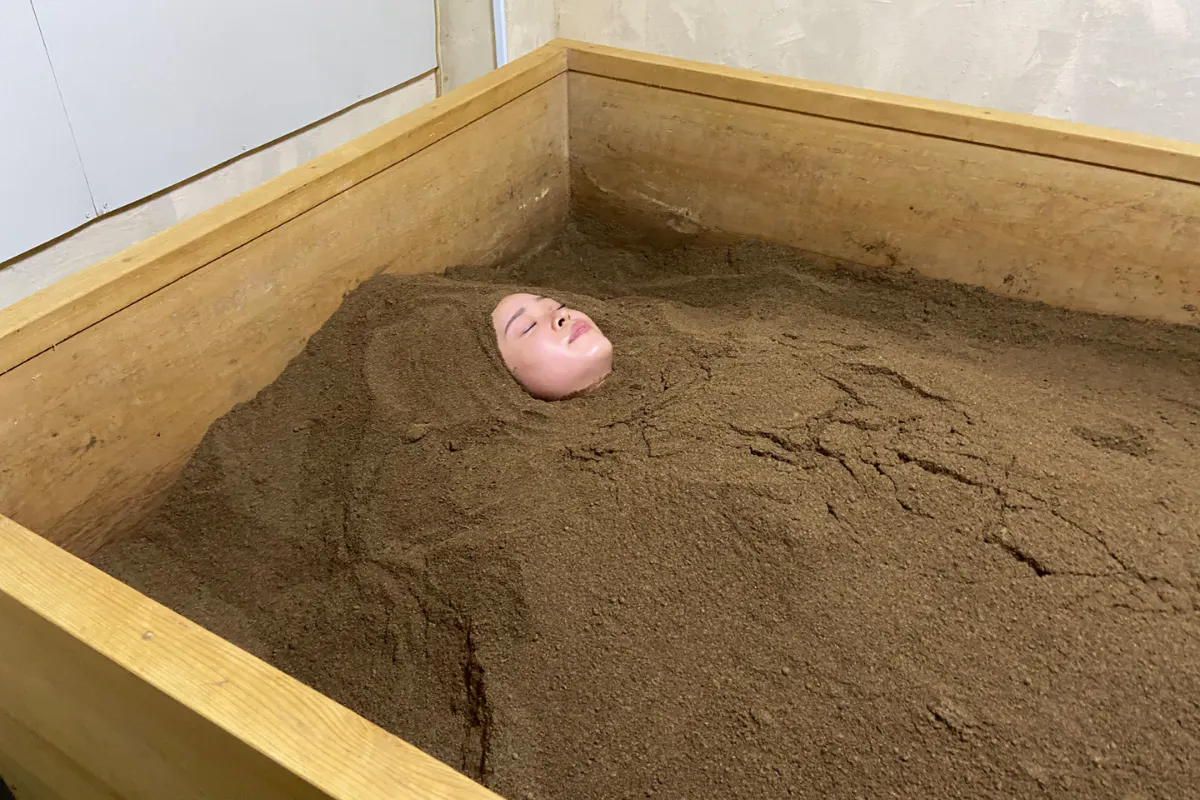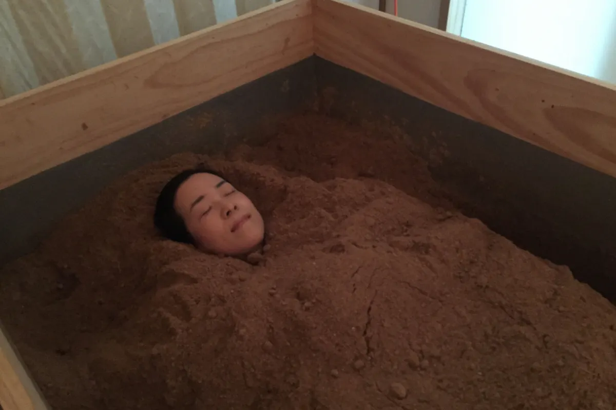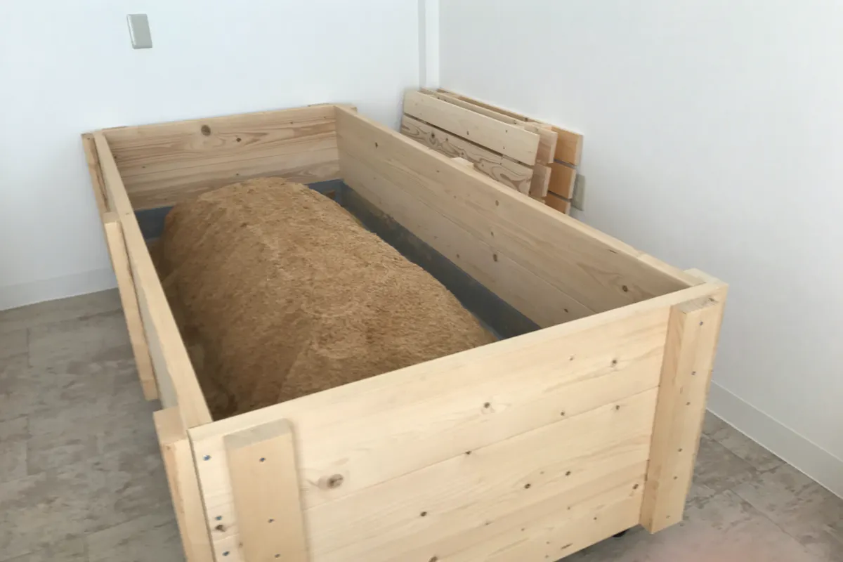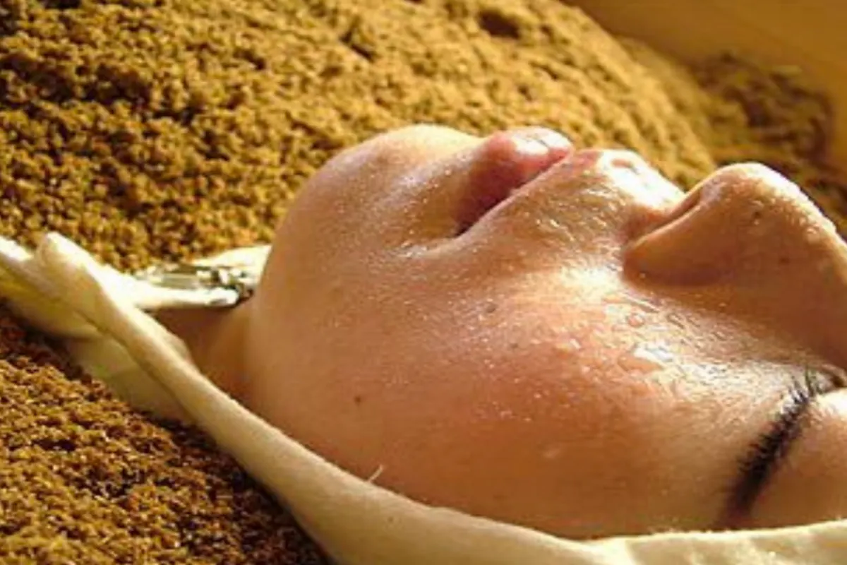 この酵素風呂とは、【ひのきのおが粉】と【米ぬか】をブレンドし、そこに【酵素の菌】を入れ発酵させたものです。土俵のように盛られた米ぬかの山の中に身体をうずめて全身を温めます。
