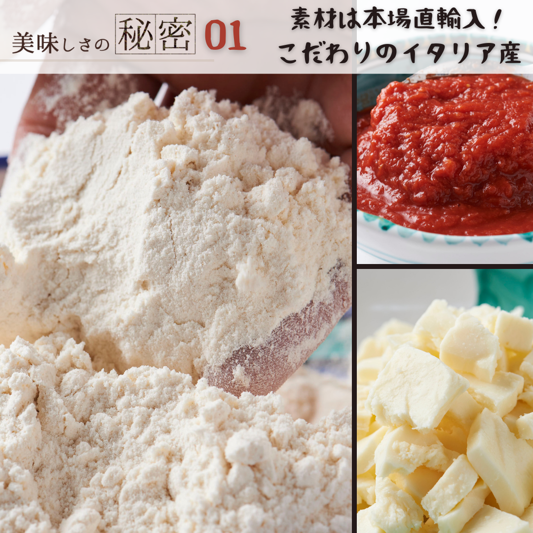 生地の美味しさの鍵である小麦粉をはじめ、チーズやトマトはイタリア産のものを使用しております。