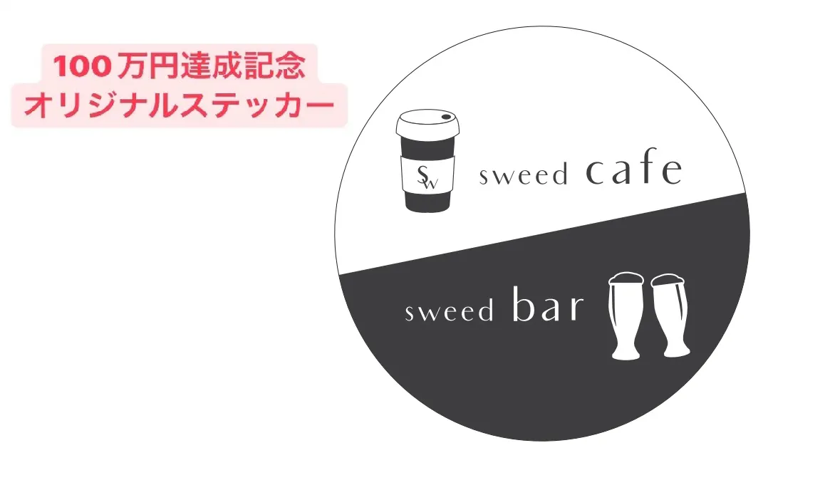 お礼状とステッカー2種類に加えて、 お店が続く限り、cafe & bar sweedのドリンクが半額になるチケットです。