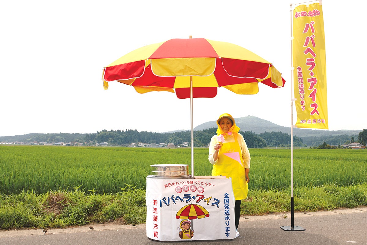 パラソル、缶、そして売り子さんで構成される日本最小級のアイスクリームショップが「ババヘラアイス」のスタイルとして定着し、いつしか、 秋田にしかない秋田の名物になりました。