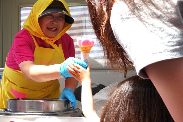 その売り方も昭和から続く伝統で、多くが「露店」という方式で行われます。断熱材を仕込んだ大きな缶に、アイスクリームの入った一回り小さい缶が入る事で、電気無しで一日中溶けずに冷却できる状態となり、その缶から売り子さんがコーンに盛り付けて販売します。