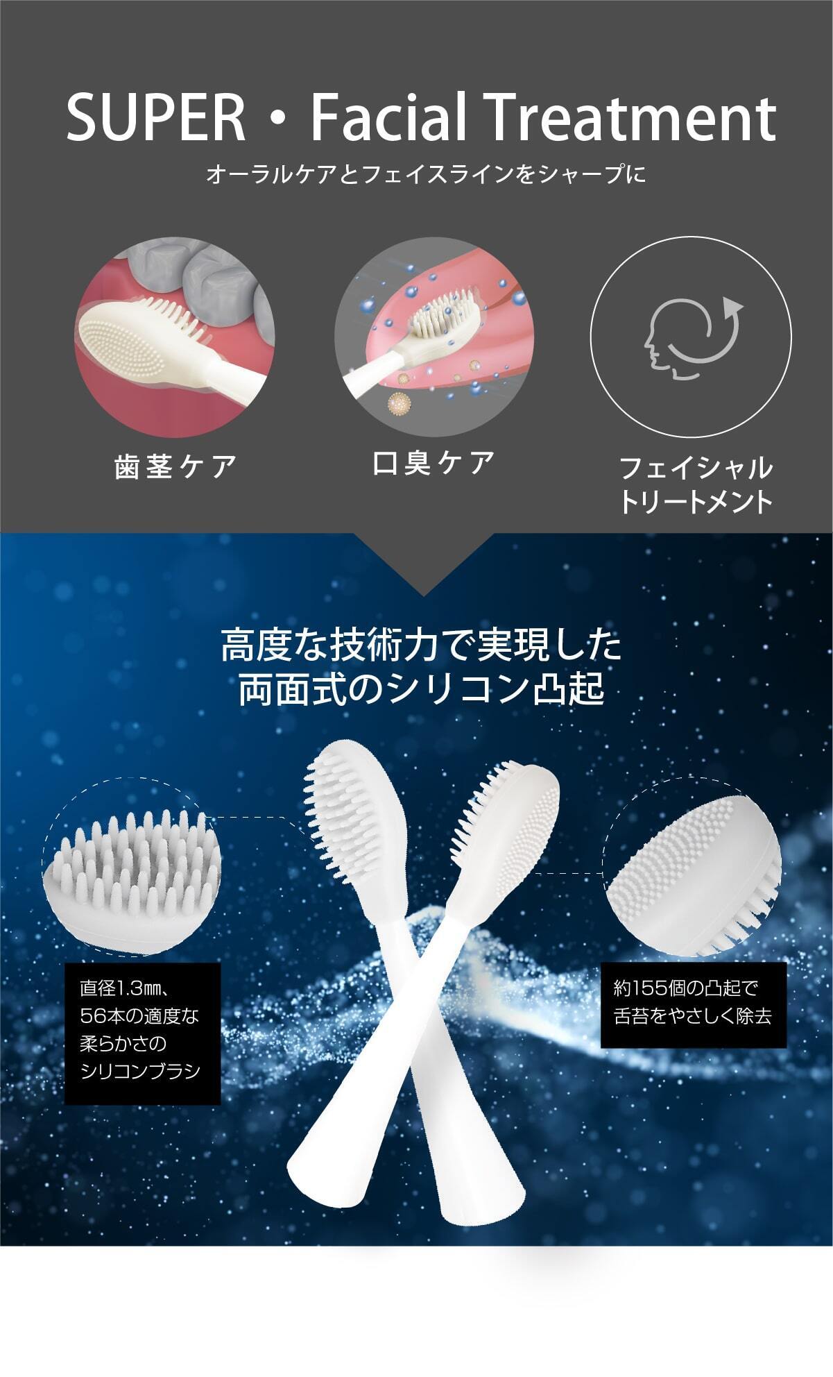 ●ブラシでは落とせない歯垢を除去先端の特殊形状のスクレイパーが超音波とイオンのWパワーで頑固な歯垢にアプローチ。使い続けることで歯垢を優しく落としていきます。