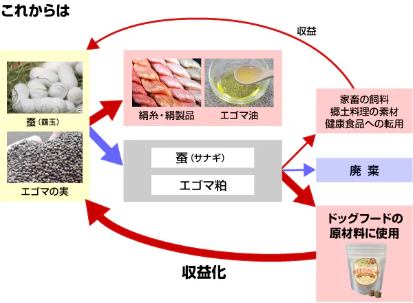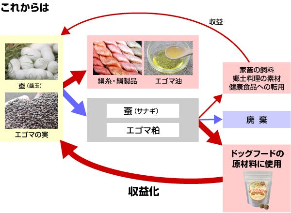 しかし、これまで廃棄していた「蚕」「エゴマ粕」を一転して収益となる「ドッグフードの原材料」として利用することで、「廃棄物処理」「収益化」の課題解決の一助となり、地場産業・農業の発展に弊社の取り組みが少しでも寄与できればと考えています。