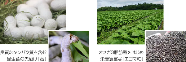 「蚕」「エゴマ粕」とも、その栄養価の高さとバランスの良さから、ドッグフードの原材料として着目しました。