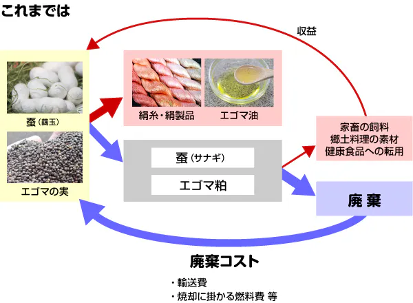 「蚕」も「エゴマ粕」も地方の地場産業・農業の現場で、まだまだ価値があるものの未利用資源として廃棄され、その廃棄コストは重くのし掛かり、産業の振興・発展や新たな人材育成の妨げとなっていました。
