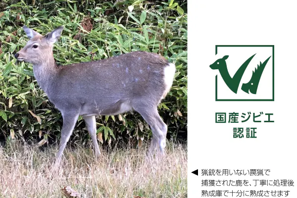ニホンジカにおいても同様で、里山の食害抑止や生態系維持のために、里山まで下りてきてしまい罠に掛かって捕獲された鹿を利用しています。ここでも、オーストラリアの野生カンガルーや野生ヤギと同様に、人の食用に供されるものと全く同じ処理・熟成・加工を経て、農林水産省の「国産ジビエ認証」を取得した確かな品質のジビエ肉を使用しています。
