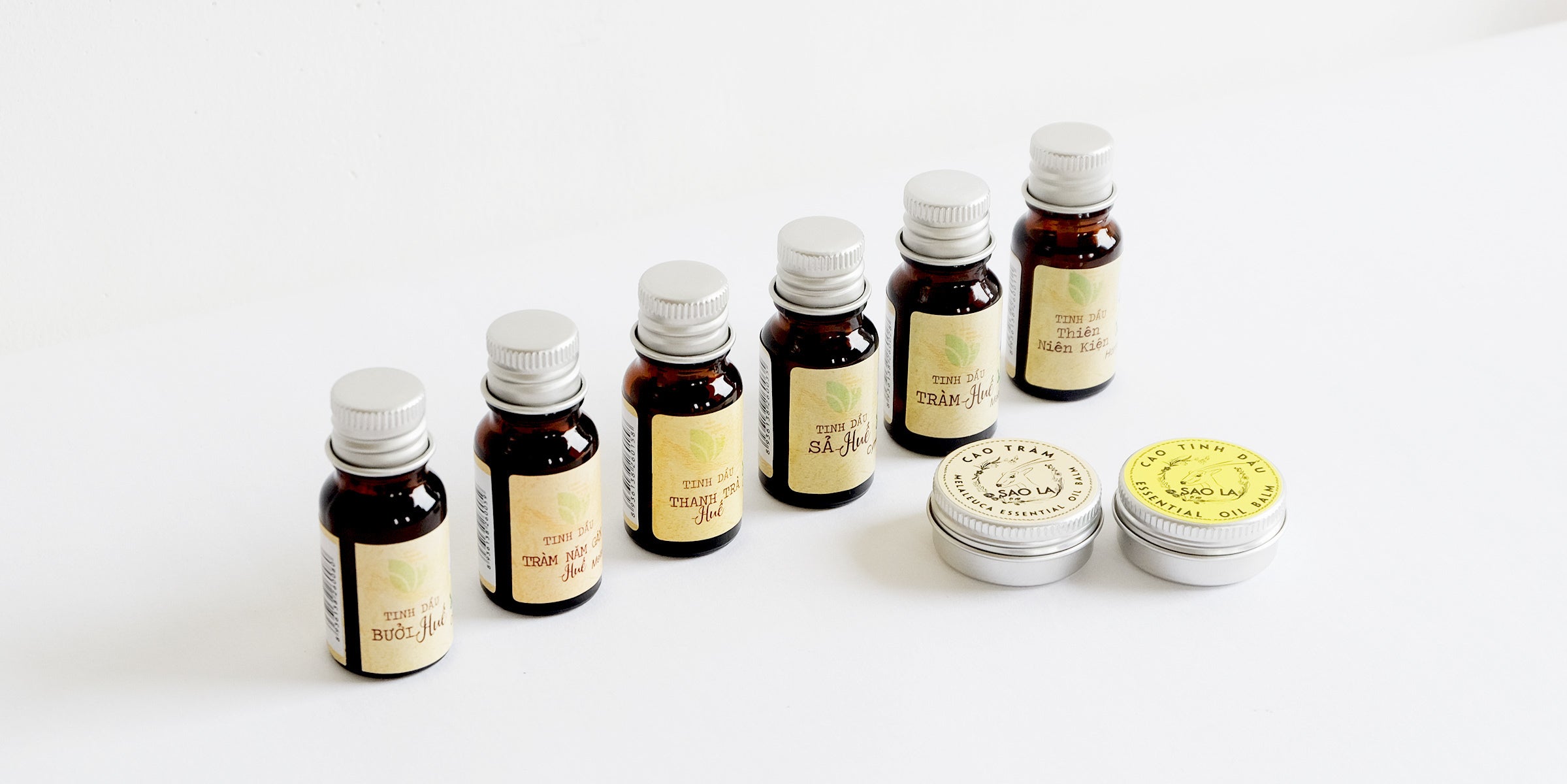 今回、海外に知らされていないベトナム逸品を探すときに、わたしたちが出会ったのはSAOLA®エッセンシャルオイルです。レモングラス(lemongrass)を始め、カユプテ(cajeput)、ニアウリ(niaouli)、ブンタン(pomelo)といった、日本ではちょっと珍しい香りばかり 。全ての原料採取から加工・生産までベトナム中部のフエ市で行われるのです。(たまたまですが、わたしもフエ出身)