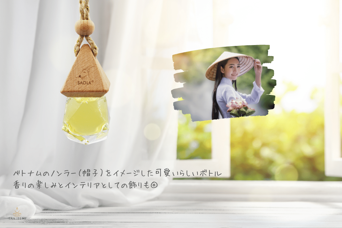 容器はベトナムの伝統的な帽子「ノンラー」をイメージした可愛いらしいボトル。キャップの所で紐がついているので、家の窓や車に吊るして香りを楽しむと共にさりげなく空間のエスニックな飾りにもなります。