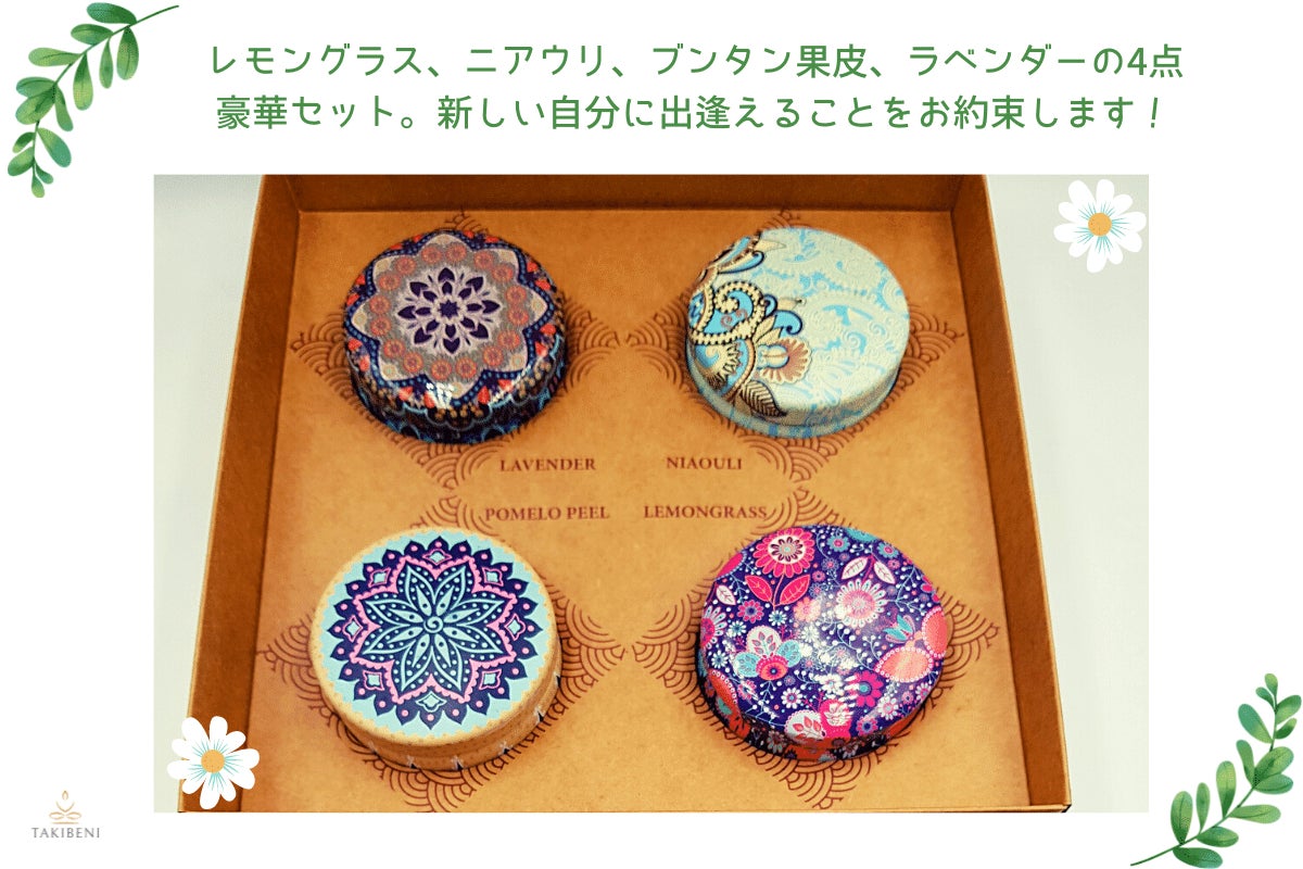 レモングラス、カユプテ、ニアウリ、ブンタン果皮、南国の森を忠実に再現した香りの4点セットです。すべてお手元にあるならば、それぞれの繊細な違いをお楽しみいただけます。