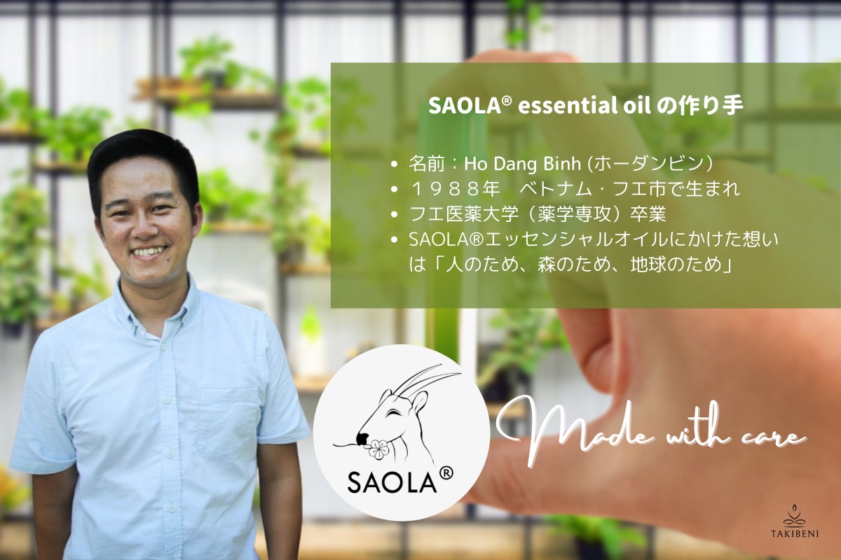 「SAOLA®エッセンシャルオイルすべての商品はMade with careという想いで作られています。"care"は色々な意味を含めますが、心を寄り添うことが一番ですね。"care"の対象は人だけではなく、動物、森、地球の全体を含めます。SAOLA®エッセンシャルオイルは人のため、森のため、地球のために作られています。」