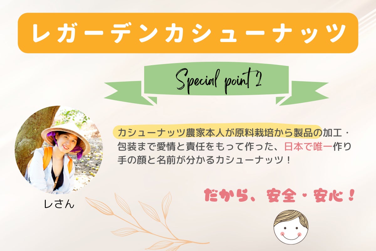 二番目の違いは安全・安心にこだわるところです。レガーデンカシューナッツはレさんというベトナムのカシューナッツ農家出身の人が原料栽培から製品の加工・包装まで挑んだものです。「レガーデン」という名前はLe Gardenの英語から、レ家の農園という意味です。化学薬品に依存しない伝統的な栽培法で採取したカシューナッツを、無添加、無保存料、無化学処理で加工し、小さいお子さんから妊婦さんまで安全・安心・美味しく食べられるものにしたいというのはレガーデンカシューナッツのコンセプトです。