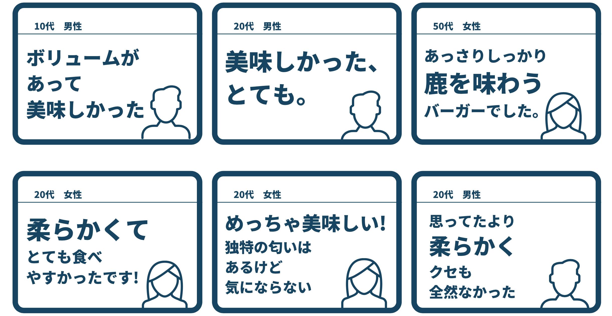 鹿肉を食べたことがある方にも、初めて食べる方にも高い評価を頂いており、「もう一度、鹿肉を食べたいと思いますか?」という問いには100%の方が「はい」と答えています。