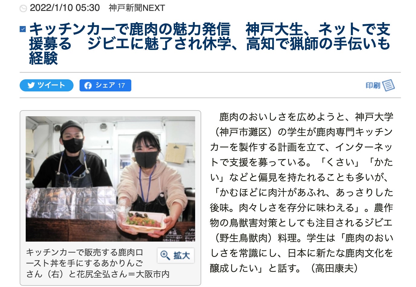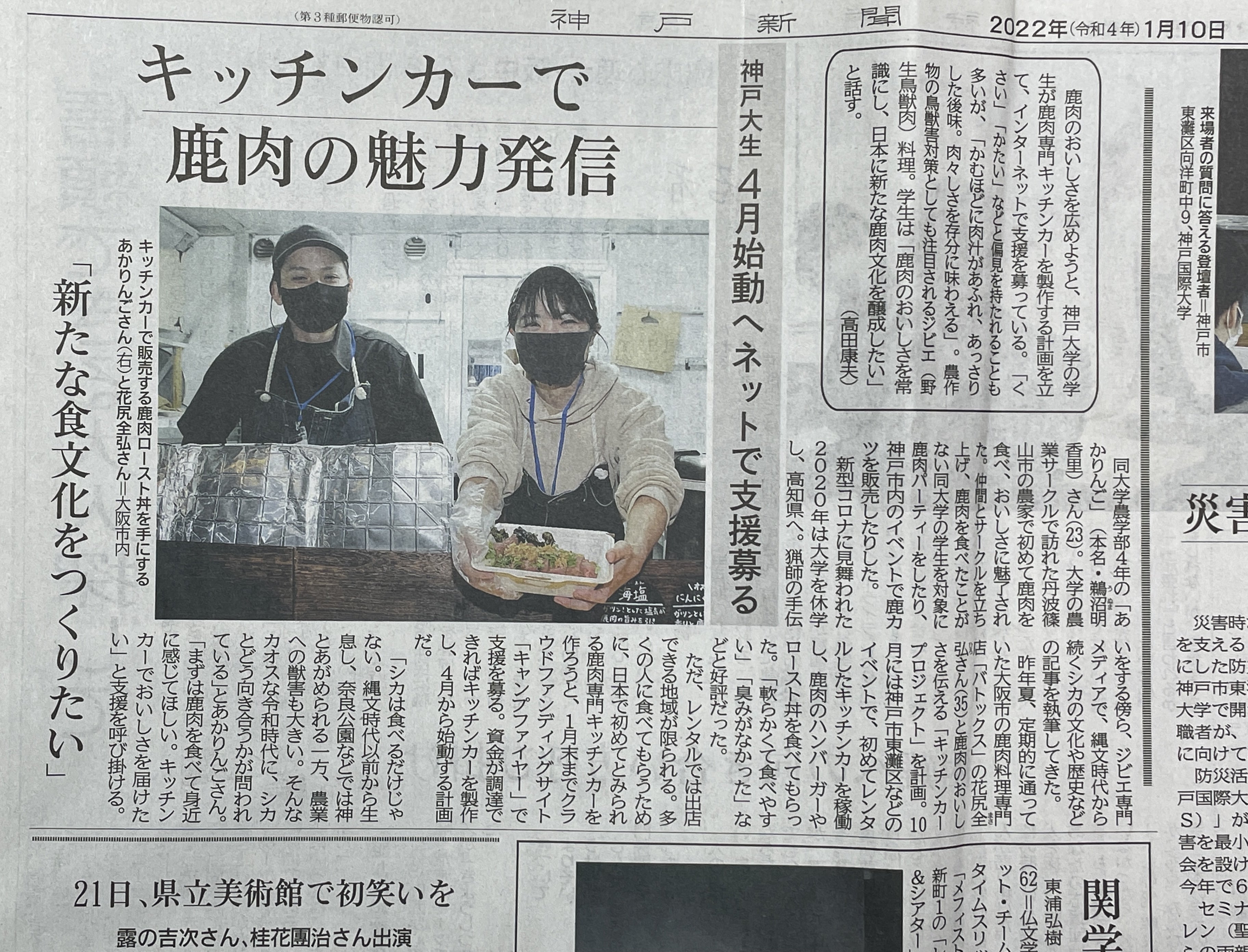 1月10日の神戸新聞さんに鹿肉専門キッチンカーの出店を取り上げて頂きました。