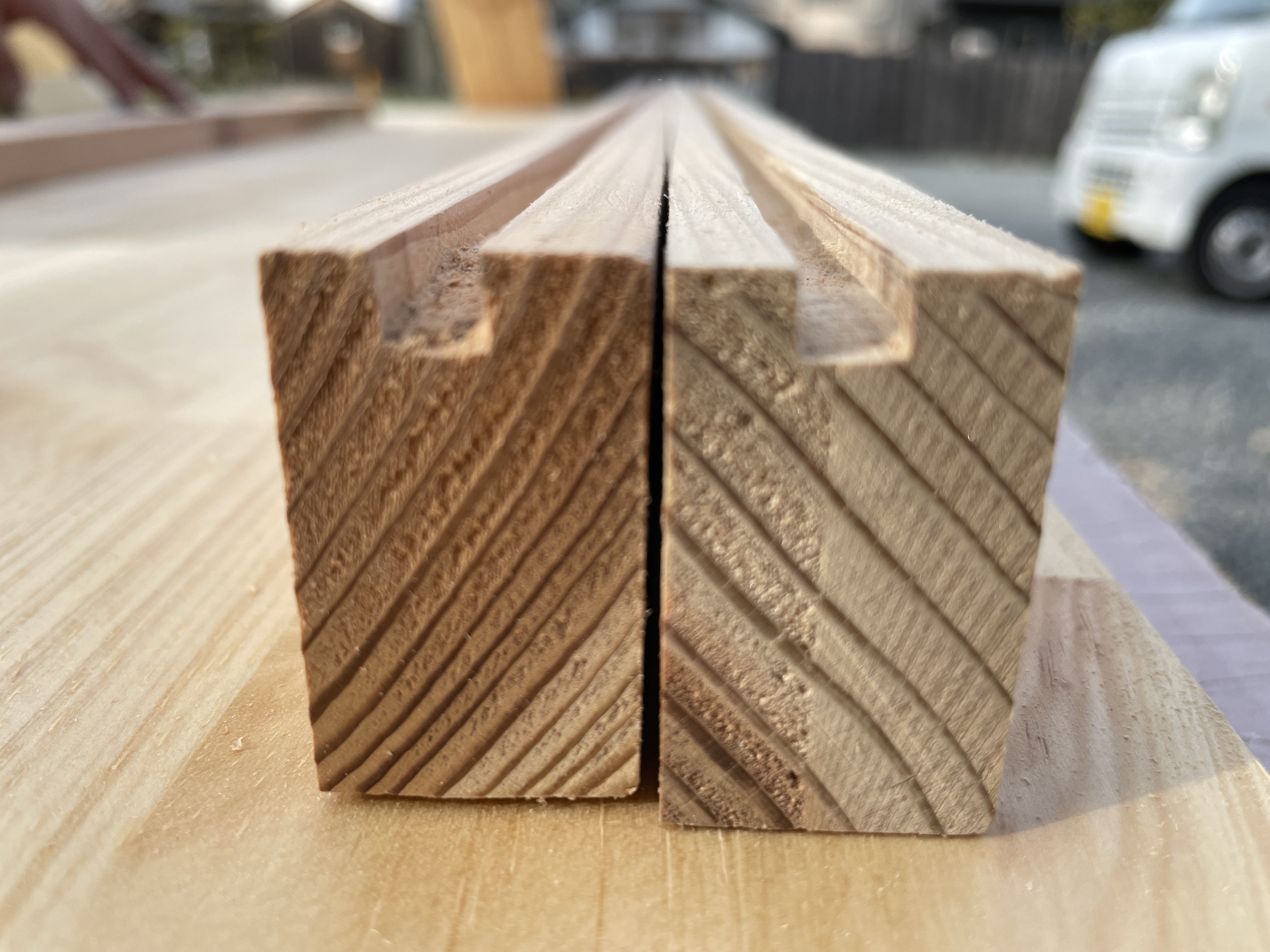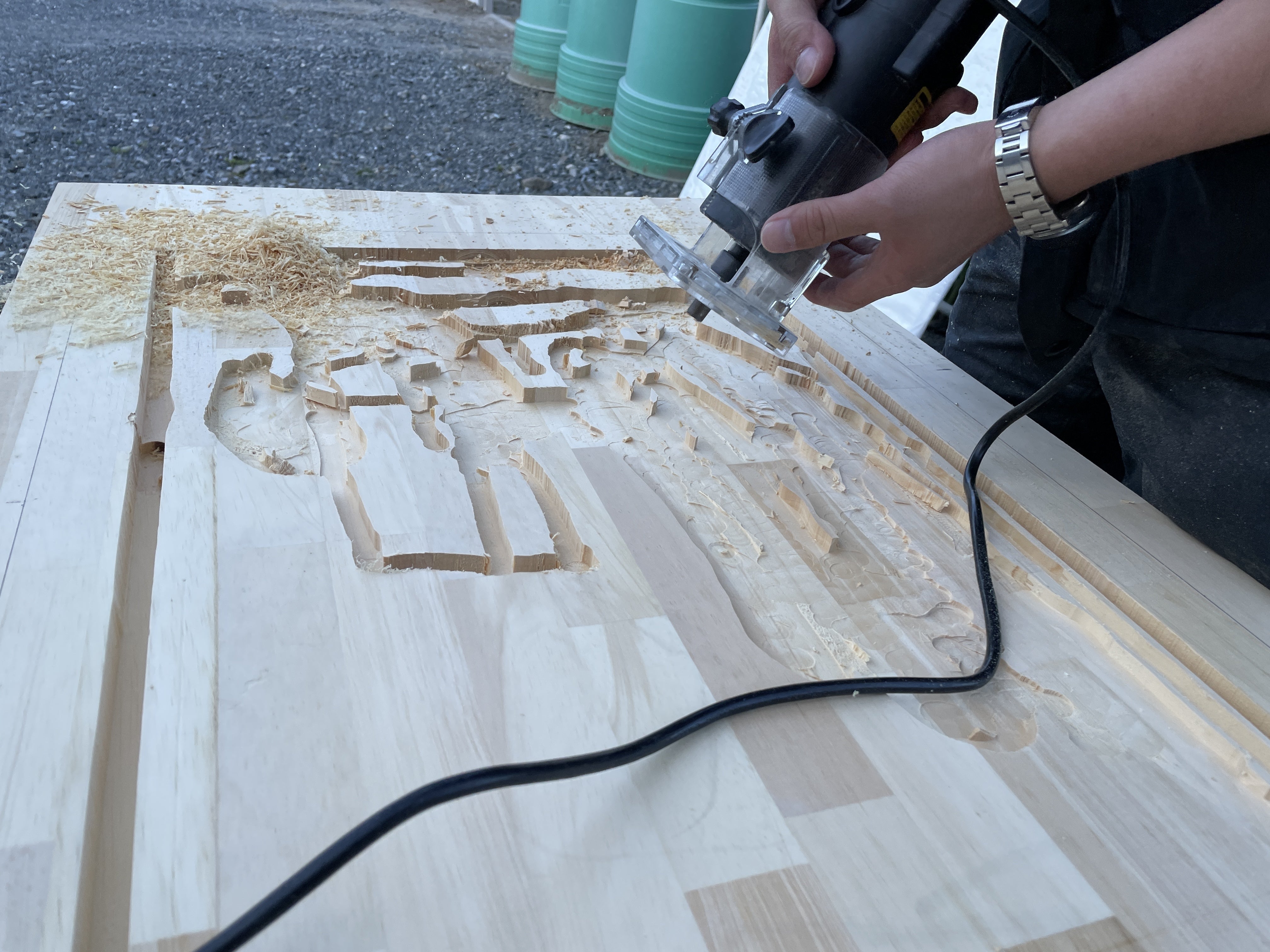 棒状の歯が回転して溝を作ることができる機械「トリマー」を使って、材に溝を彫り…