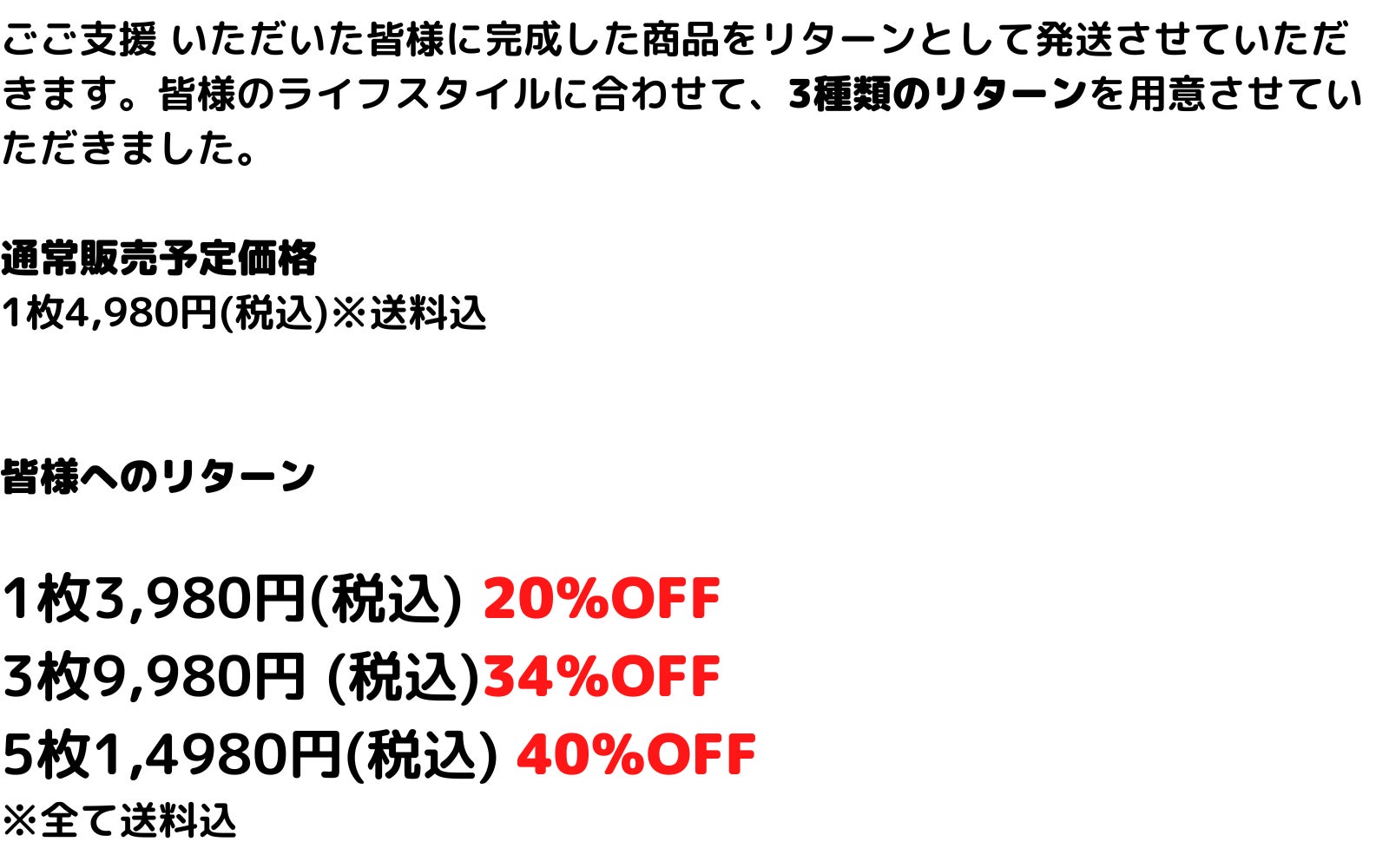 ●対価以外に必要な費用:プロジェクトページ、リターンに記載のとおり。