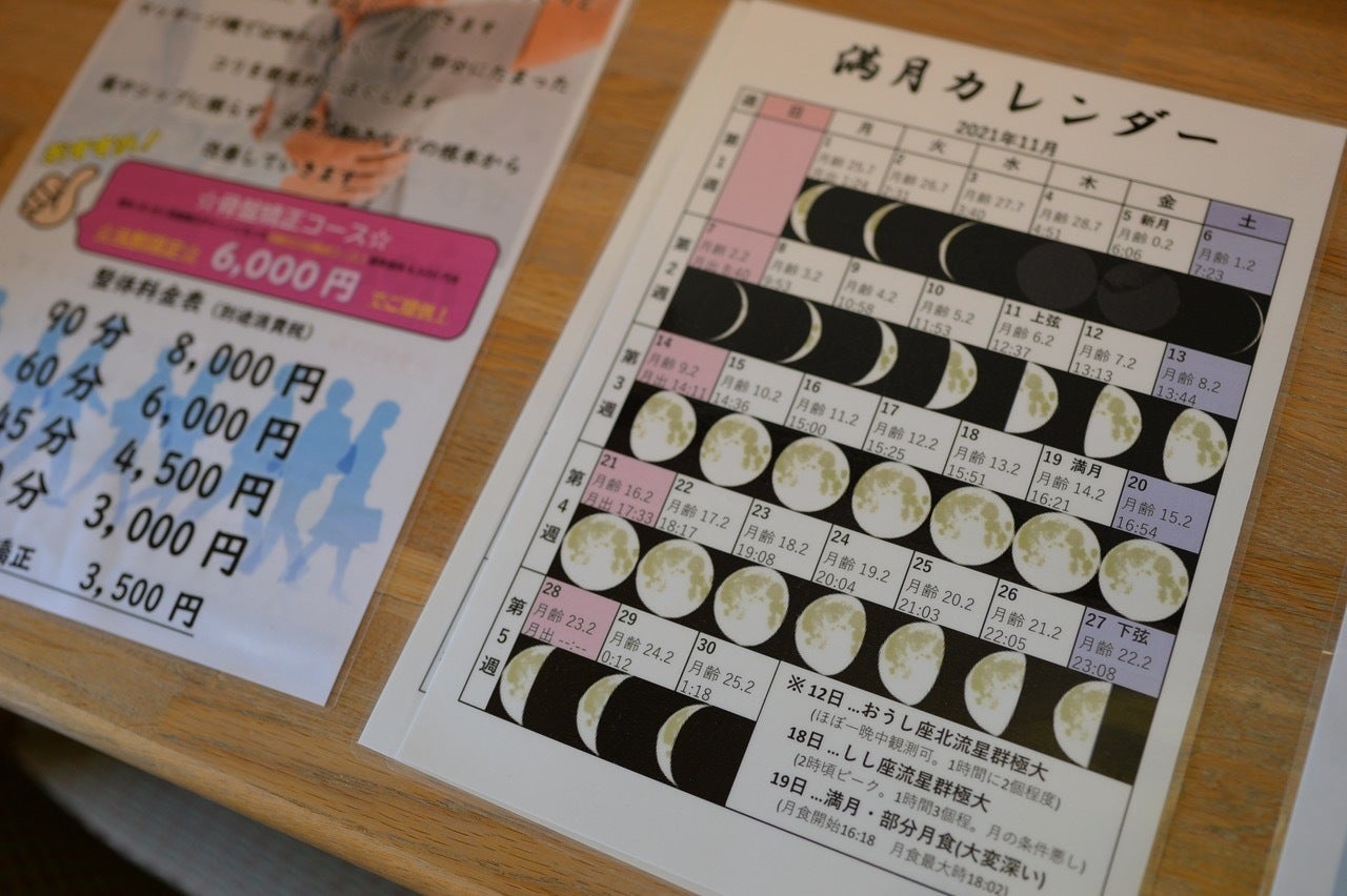 部屋から見える「月」を楽しんでもらうべく満月カレンダーを各部屋に置いています