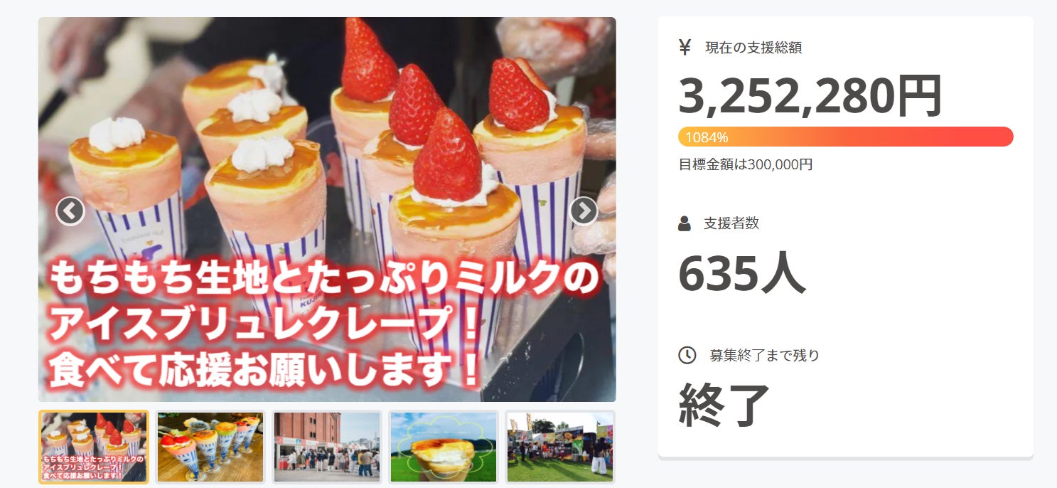 2022/05/22 22:47皆様ご支援誠にありがとうございました!昨年秋に行った飲むクレープのプロジェクトに引き続きアイスクレープのプロジェクトを開催させていただきました!【生産者・飲食店が抱える課題解決のために、スイーツ専門ECサイトを立ち上げたい!】URL:https://camp-fire.jp/projects/view/582500現在こちらのプロジェクトが公開中となりました!リターン品には20本セット、10本セット、5本セットをご用意させていただきました!今回のクラウドファンディングでは前回の飲むクレープとは違い【デコレーションクレープ】をお届けします。食べる際は、冷凍庫から食べたい本数を取り出して、2分ほど待つだけ!そのまま食べても美味しいですが、お好みのトッピングやチョコソースなどをかけてもOK! 誰でも簡単に2~3分もあれば自分好みのクレープが完成させられるんです!是非ご自宅でご家族でデコレーションをお楽しみください!【生産者・飲食店が抱える課題解決のために、スイーツ専門ECサイトを立ち上げたい!】URL:https://camp-fire.jp/projects/view/582500 もっと見る
