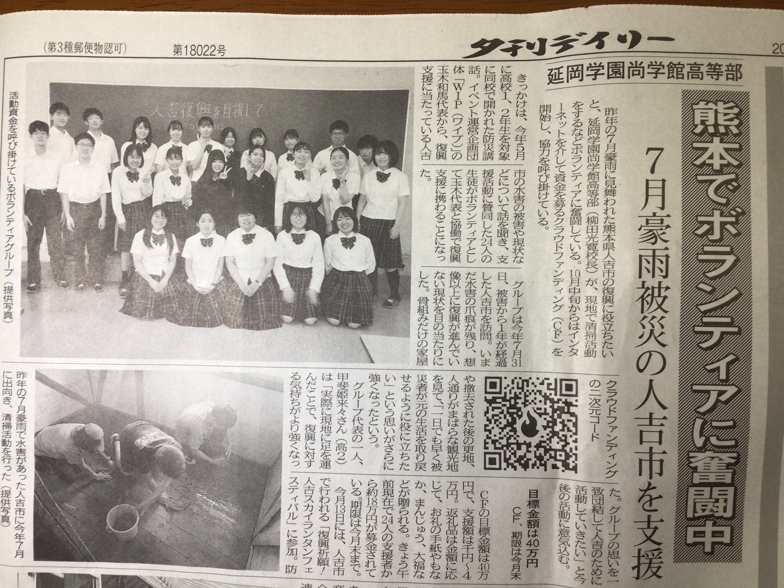 私たちの活動が延岡の地元紙夕刊デイリーで紹介されました。多くの読者に活動を知ってもらい、人吉の人々へ想いを馳せていただけたら嬉しく思います。クラウドファンディングの2次元コードも掲載していただきました。