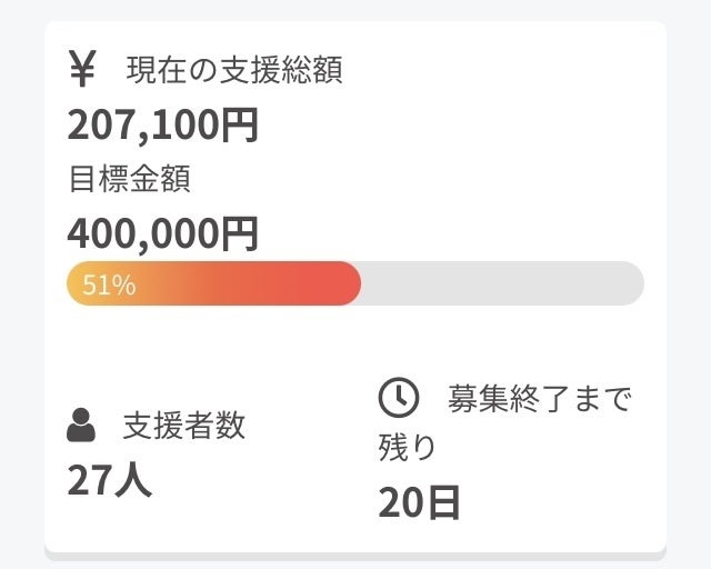 ご支援金額がついに50%を超えました!現在、目標40万円に対して51%、27名の方にご支援いただいております。ご支援、拡散していただきまして本当にありがとうございます!
