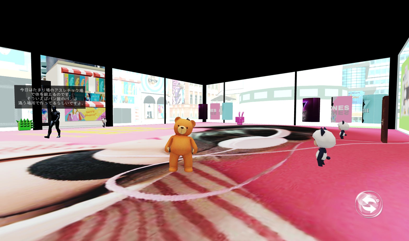黄色い矢印のマークがある建物のドアにぶつかるとショップ空間にワープします!