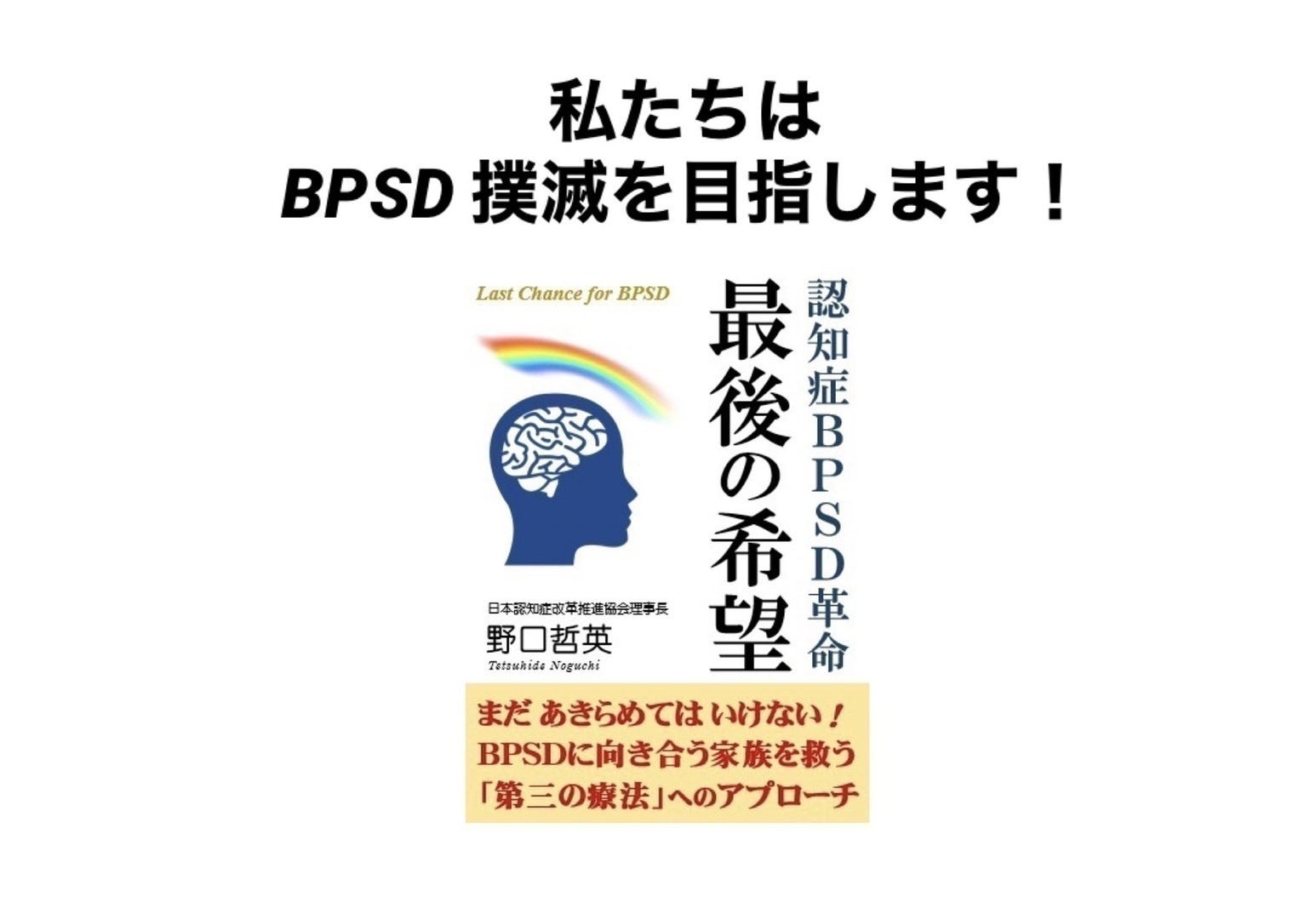 BPSD問題を早く解決し、BPSDの本人と家族、介護をする人達が笑顔を取り戻せる明るい社会の実現へ当書籍がお役に立てることを切に願う次第です。