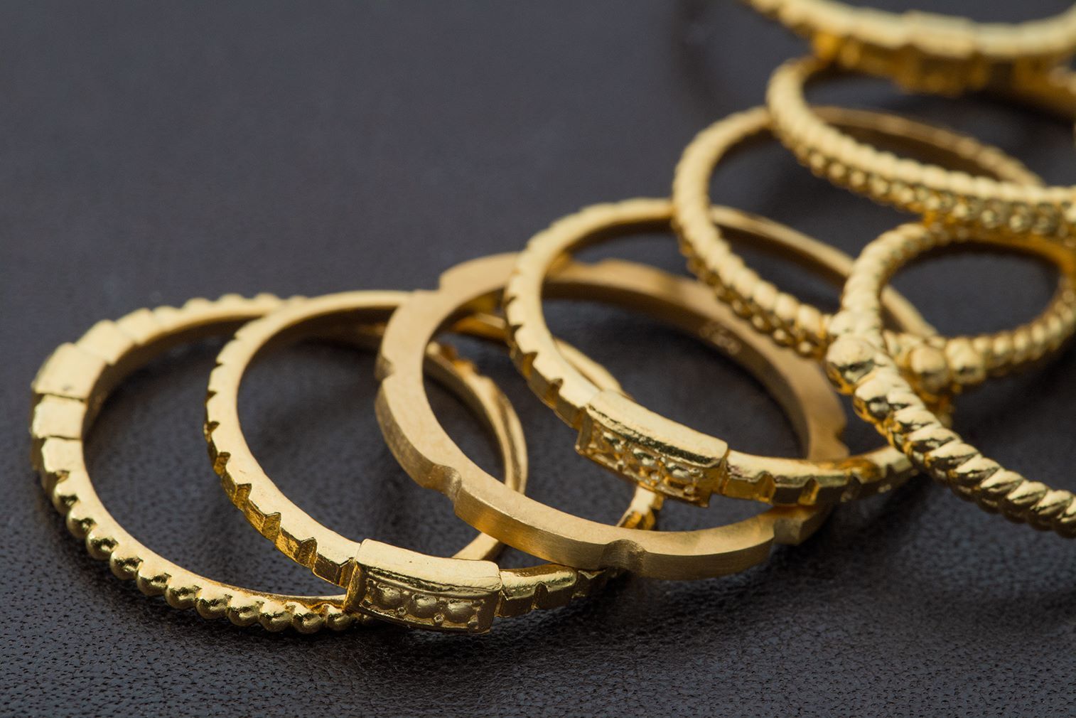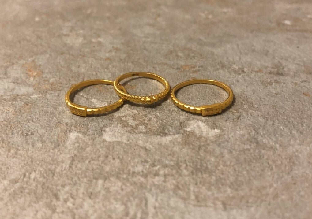 どれも2gの純金のリングです。華奢でシンプルなデザインなのに、その山吹色の輝きが存在感を与えます。使っていくうちに、肌に馴染む感じも自然の鉱物ならでは。