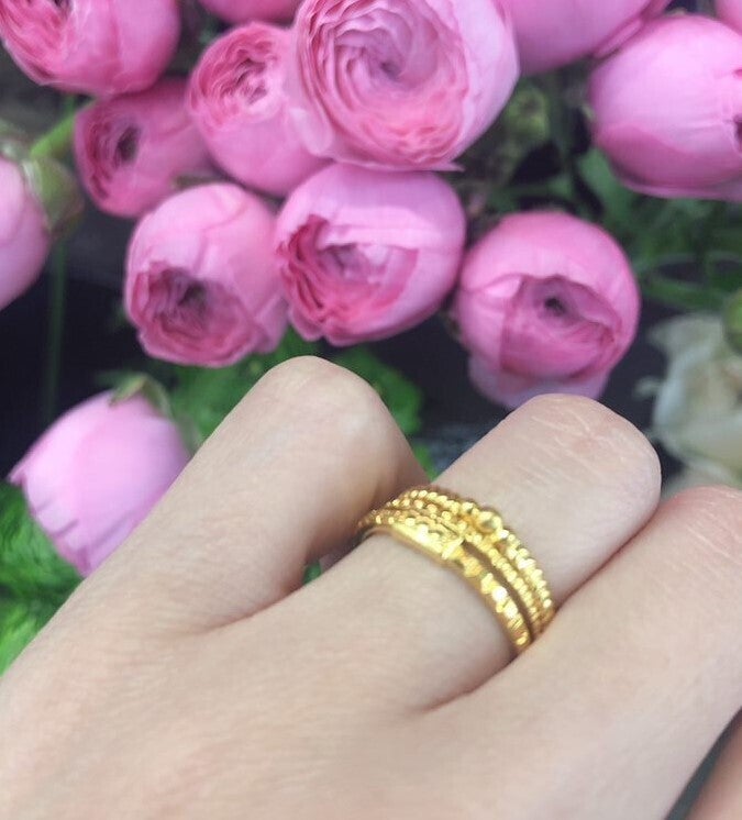 シンプルにさりげなく、でも存在感のある純金。重ね付けをしてボリュームを出したり、色んな指に着けて楽しんだり。見るたびにうっとり見とれてしまいます。
