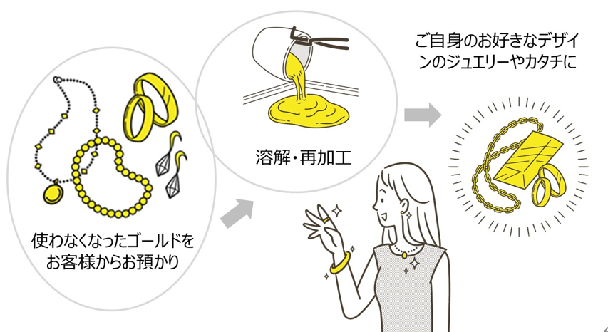 JUNGOLDでは、「かえる」プロジェクトとして、サステナブルゴールドプロジェクトを立ち上げ、ご自宅で眠っている金をカタチを変えて楽しんだり、楽しみながら「もつ」という体験をご提供しております。