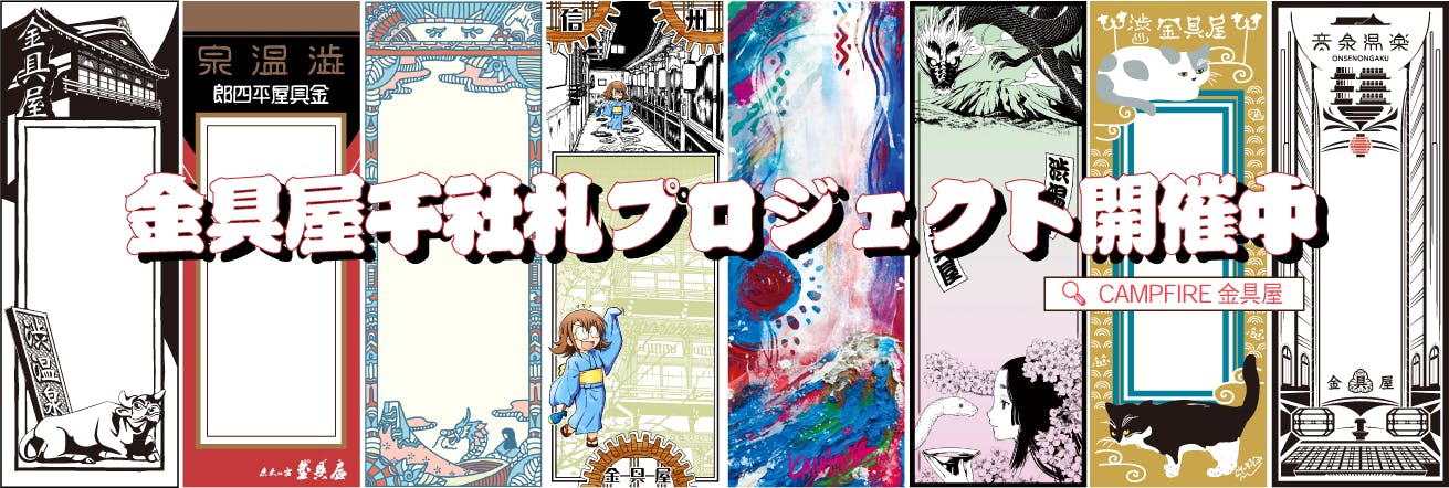 金具屋千社札プロジェクトとは金具屋の持つ登録有形文化財「斉月楼」と「大広間」の維持・管理のためにご支援いただいた方のお名前等を千社札にして、金具屋館内に1年間掲示するという企画です。