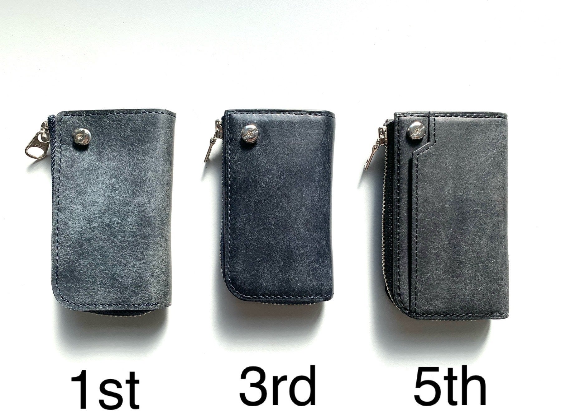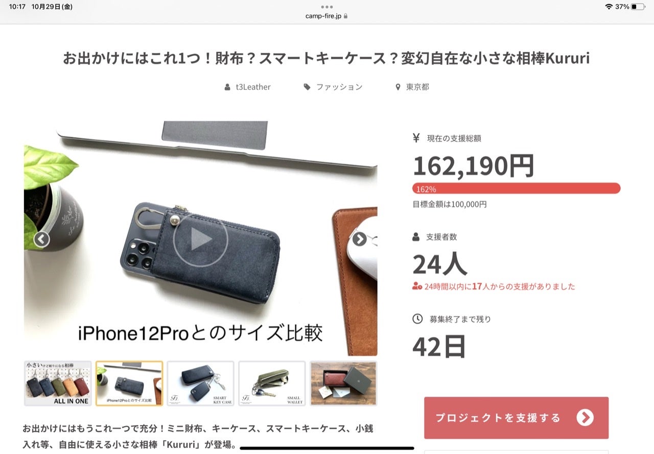 支援者の皆様へおかげさまで現在(11/4時点)の達成率は284%を超えました。数多くのご支援をいただき誠にありがとうございます。今回はKururi開発の裏話をご紹介させていただきます。Kururiの開発に辺り、なんとサンプルを5回も製作しております。1stは裏地を使用しない革の風合いを活かした仕立てで製作しましたが、画像でも何となく伝わる通り、クタクタっとした頼りない感じになりました。長い間ご使用いただくには、やはり芯材や裏地が必要。という事でできたのが、2ndサンプルです。ハリがありキチッとした印象になりました。社員から少し大きいという意見が出たため、小型化したものが3rdサンプルです。これでいよいよ完成か?!と思いきや『出かける時に持つならスマートキーだけじゃなくて免許証とか入れたい』という社員の声があり、再度型紙を取り直し完成したのが4thサンプルです。4thサンプルではカードは背段のポケットにのみ収納できたのですが、免許証等を外ポケットに入れるのは怖いと思い、試行錯誤の結果『サイズ感を変えずに中にカード収納を可能にした』のが5thサンプルです。長くなりましたが、こうして誕生したKururiはスマホサイズのコンパクトさながら収納力もたっぷりの自信作です。ご支援を検討中の方も引き続きご検討宜しくお願いします!