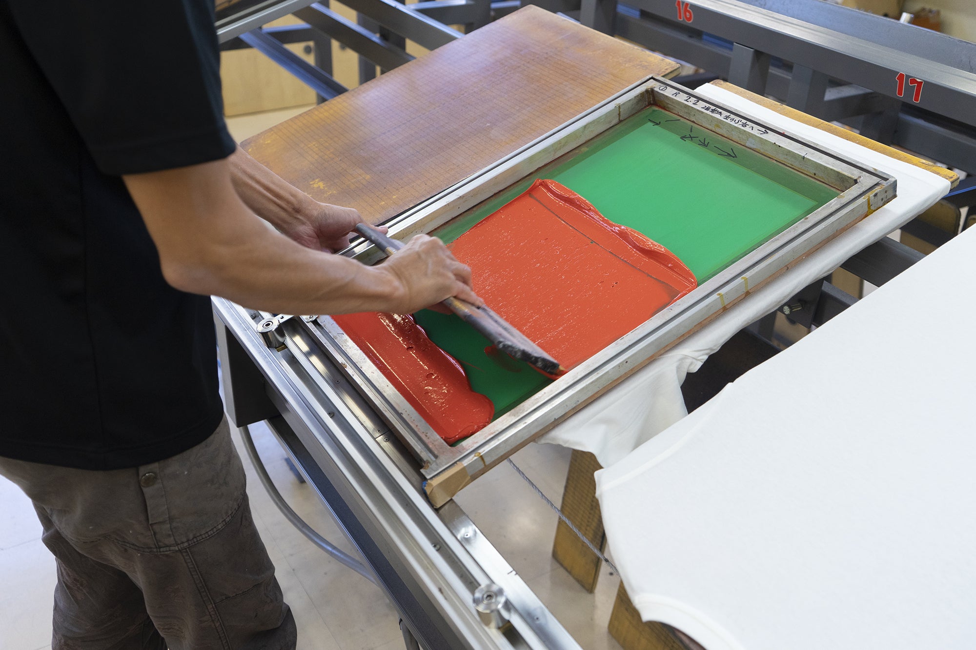 その間にもシルク版を水洗したり、インクのノリ具合をチェックしたりと細かい工程があり、印刷する前にも入稿されたデザインをもとに版を制作したり、プリントする際に使用するインクの色を調合したりと聞くまで知らなかった工程が多いことにびっくりしました。