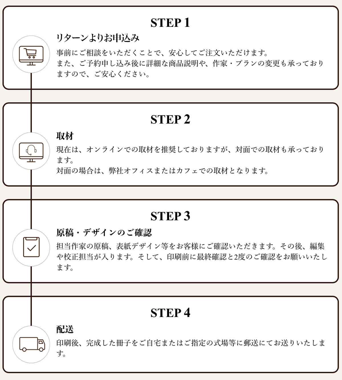 ウェディング小説以外のリターン品、バリューシート、ファミリーストーリー、ギフト小説などは大まかな制作の流れは同様ですが、制作工程が多少変わりますので、ご支援いただいた方に直接ご連絡差し上げます。