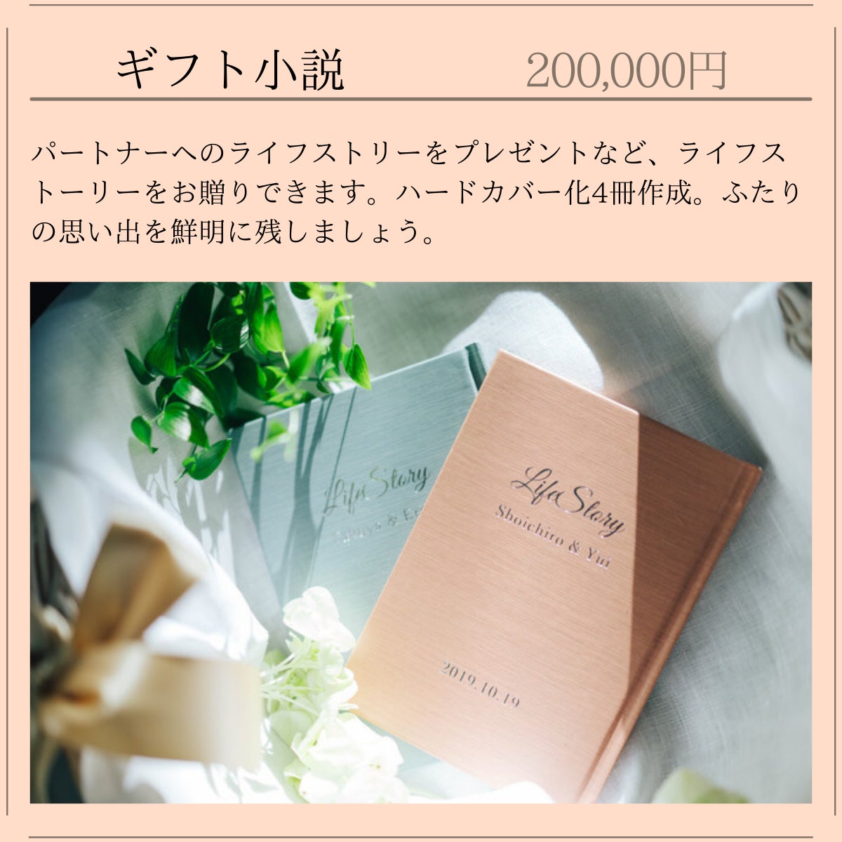 ウェディング小説以外では、名刺代わりの自己紹介シート「バリューシート」、ウェディングメディア掲載、ライフストーリー作家 ®との相談会や、弊社提携のフリーウェディングプランナー相談会、スポンサー様などたくさんのリターンをご用意しております。詳しくはリターンの一覧をご覧ください。
