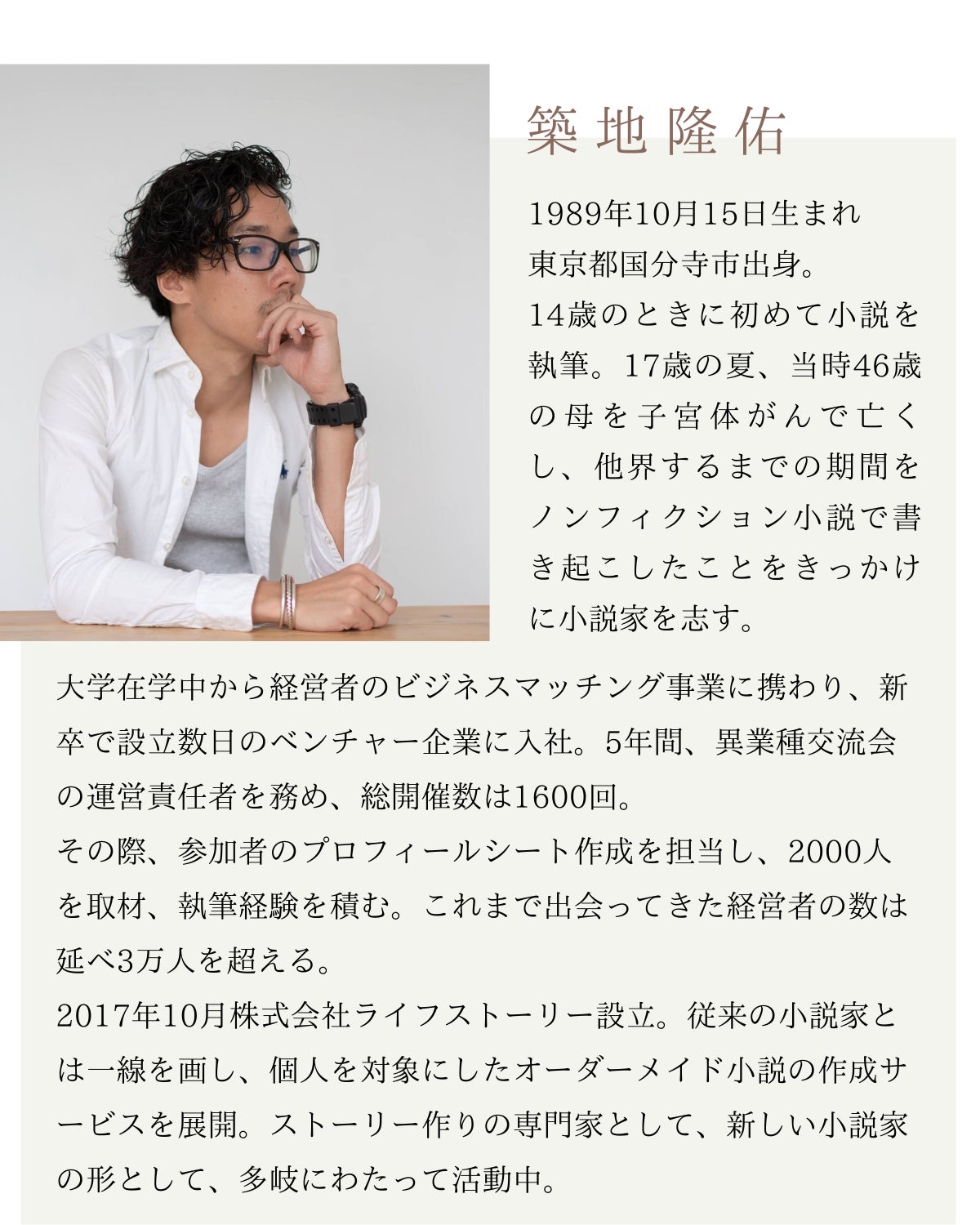 ページをご覧いただきありがとうございます。ライフストーリー作家®︎の築地隆佑と申します。主に人生物語に特化したストーリー作りの専門家として活動しています。