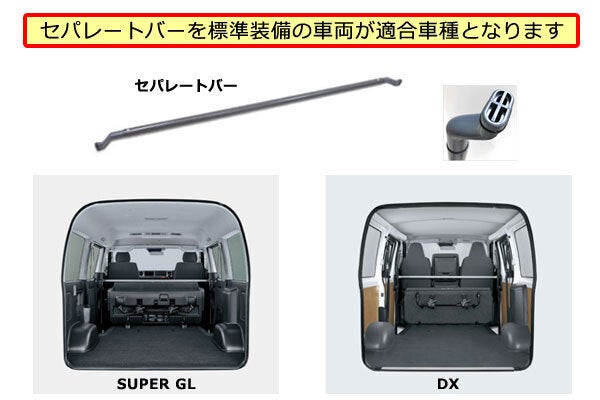 『キャッチアダプタ』はセパレートバーの形状に合わせた専用設計のため、ハイエースバンの型式やグレード、ボディの長さや幅、さらにはルーフ形状に関係なく全てのハイエースバンに適合します。