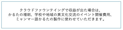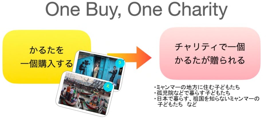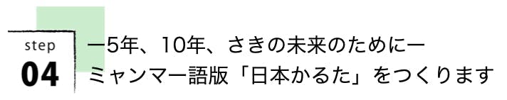 ミャンマーの若者や子どもたちに、日本の暮らし、風習、食文化などを伝えるために、ミャンマー語で「日本かるた」を作り、ミャンマーの子どもたちに渡したいと考えています。将来的には、「日本でかるたが1個売れたら、ミャンマーにかるたを1個チャリティで贈る」ことを目標にしています。
