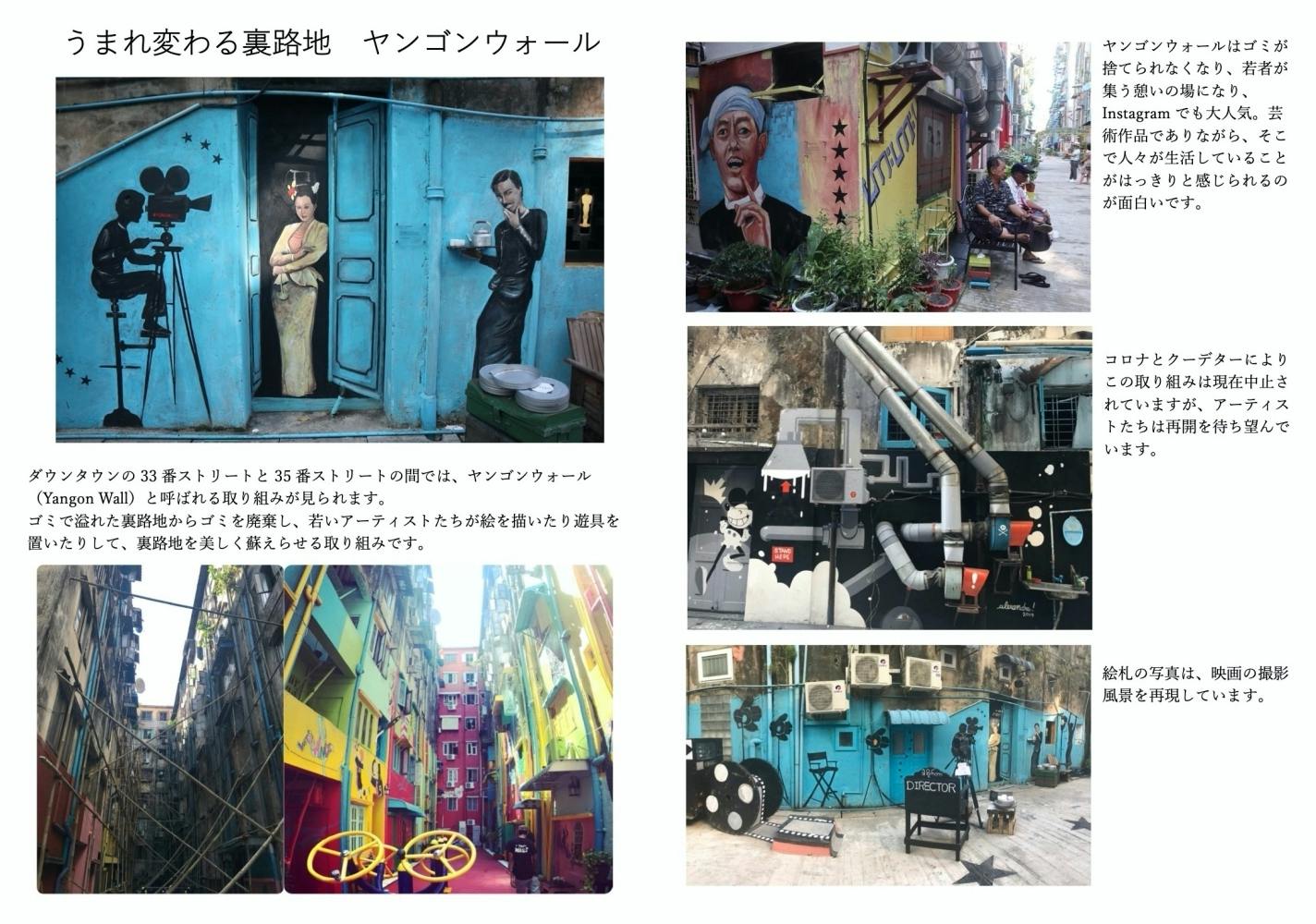 この札を撮影した場所は、ヤンゴン中心街の裏路地です。以前はゴミが山のように積み重ねられ、荒れた裏路地でした。しかし大量のゴミを廃棄しアーティストが壁に絵を描いたことで、美しい裏路地がよみがえりました。