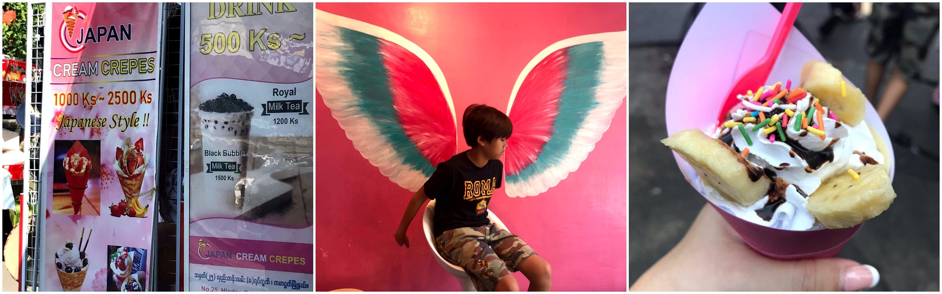 ヤンゴンにお気に入りのクレープのお店がありました。東南アジアだとガレットのお店が多いのですが、ここは生地がフニャッとして生クリームがいっぱいの、まさに日本のクレープ。ジャパンと付けばなんでも高いのに、現地価格と比較しても高くない。100円くらい。レーダンという若い人が集まる地域にありました。