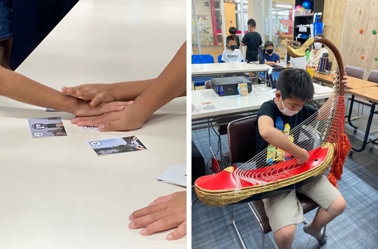 みんなでサウンガウ体験。それぞれが自分で持って、弦を弾くと、「素敵な音ー!」と歓声が上がり、写真やビデオ撮影で盛り上がりました。