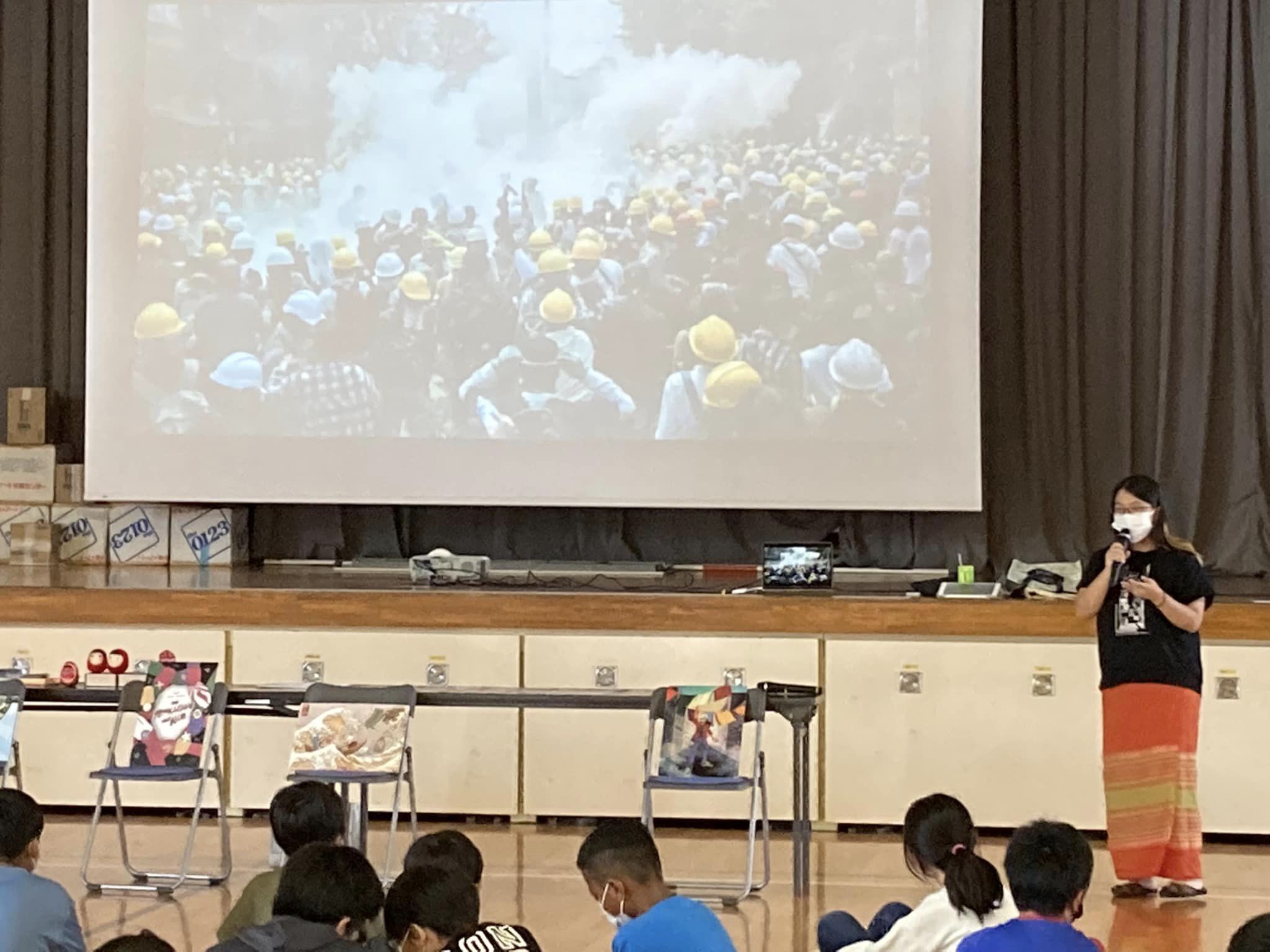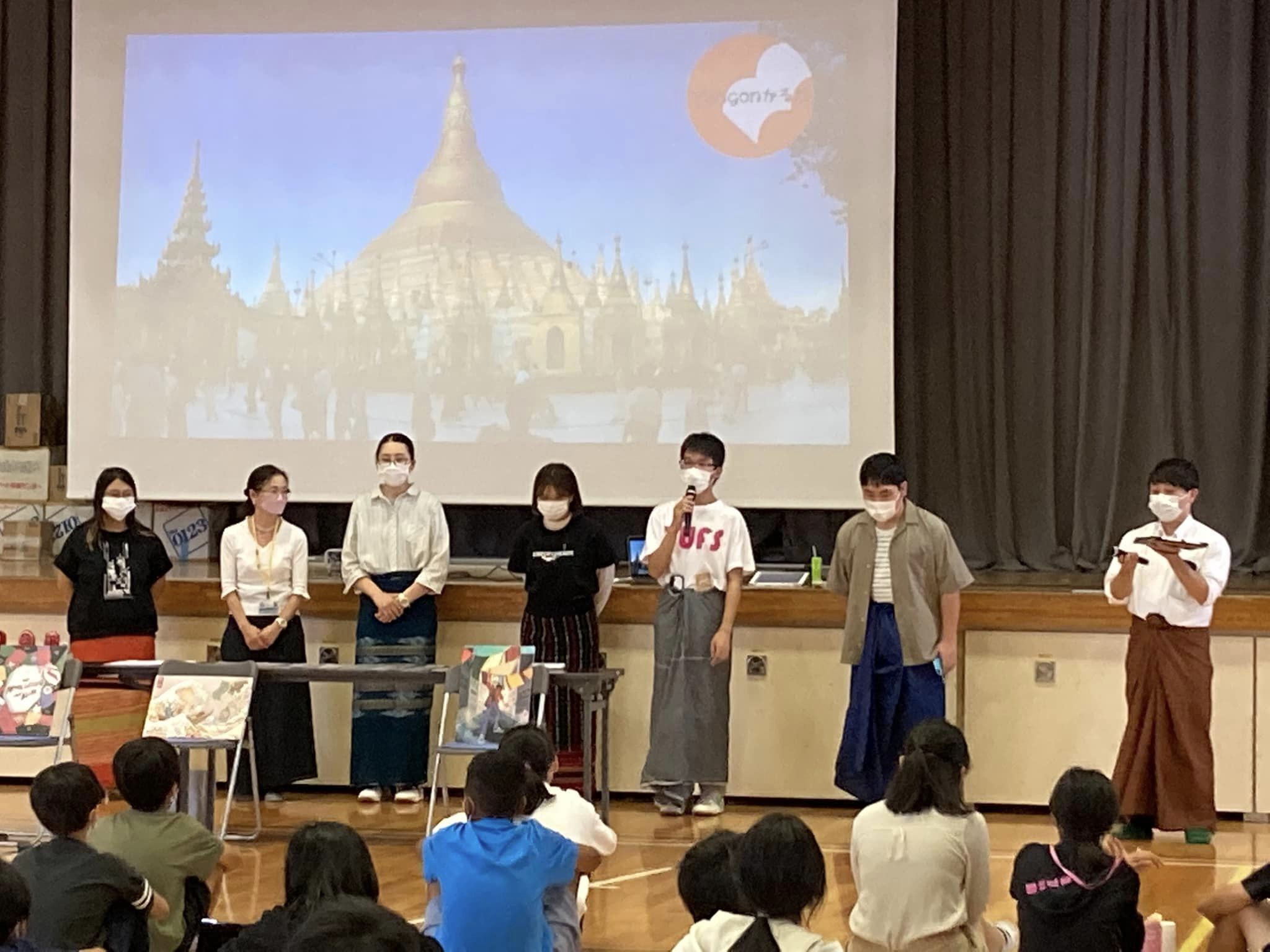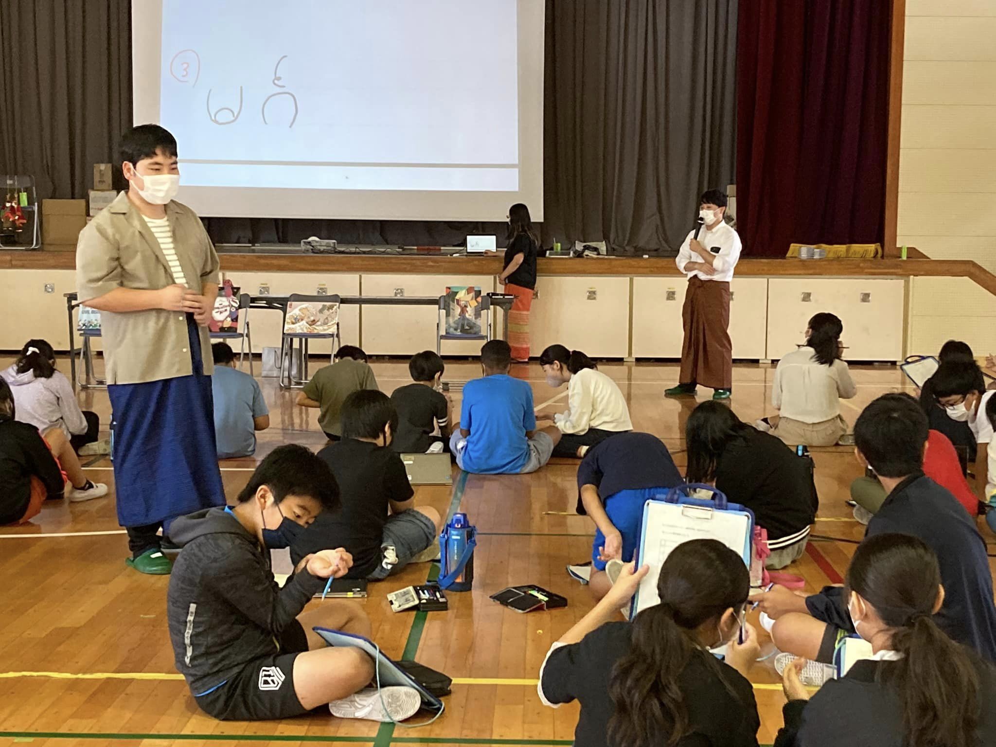 規模は、なんと過去最大の小学校5、6年生100人。1〜4時間目の授業内に、ミャンマーについて伝えました。普段のメンバーの他にも、東京外国語大学や東京女子大学から応援に来てくださいました。