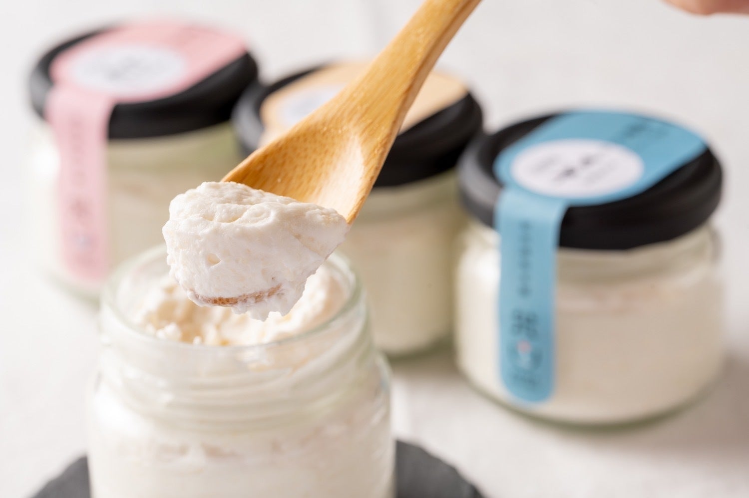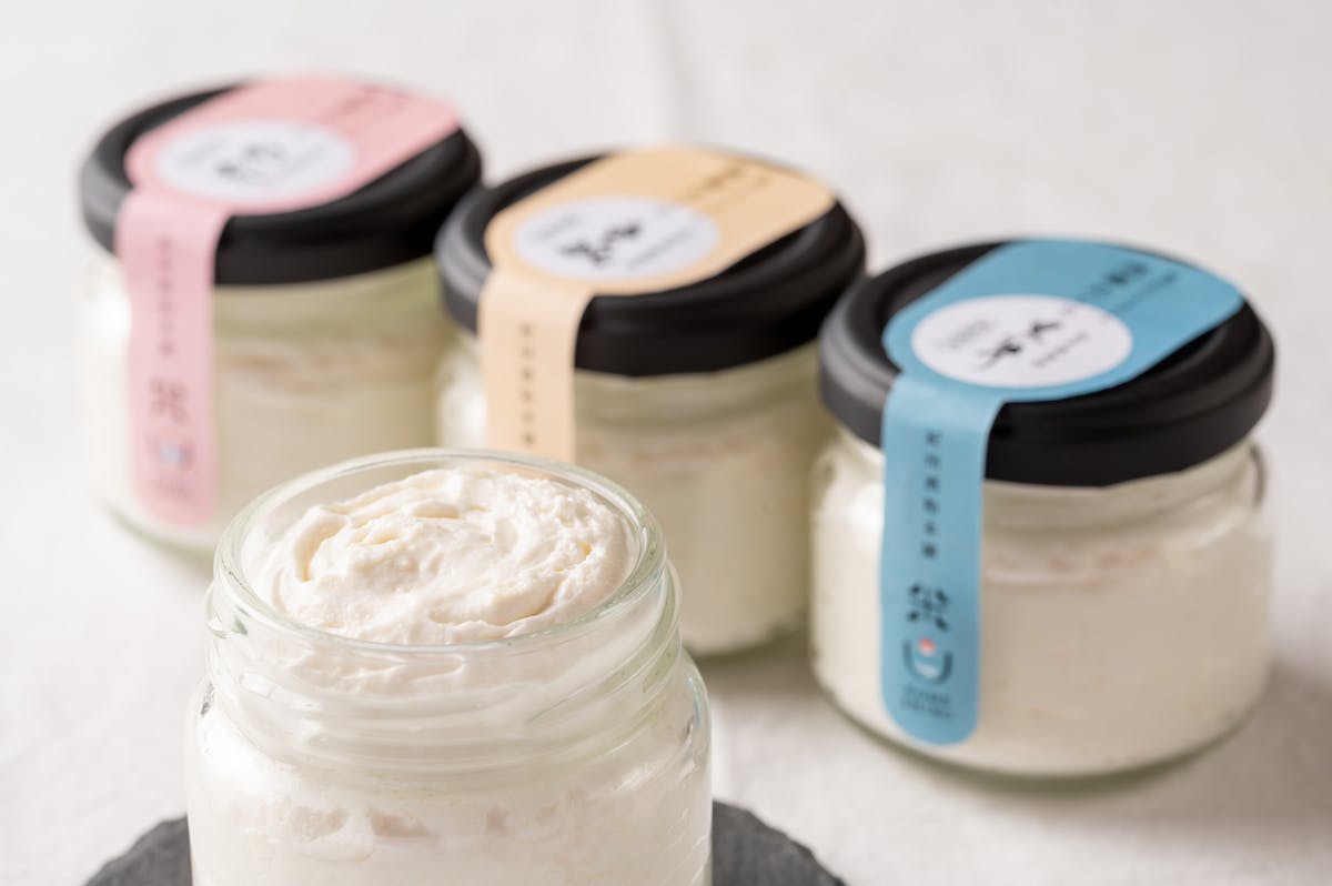 10度以上50度未満で酵母は動きます。一部火入れをしない生の酒粕がブレンドされているだけのこのレアチーズケーキは、まさに「生きたチーズケーキ」。食べ始めの鮮烈な風味と食感、そして2匙目、3匙目と食べ進めるにつれ少しずつ柔らかく、マイルドに。食べ飽きることなく変化を楽しみながら味わえるチーズケーキです。さらに3種がそれぞれの香りと食感を持っているため、並べて食べ比べると楽しみ方が倍増します。
