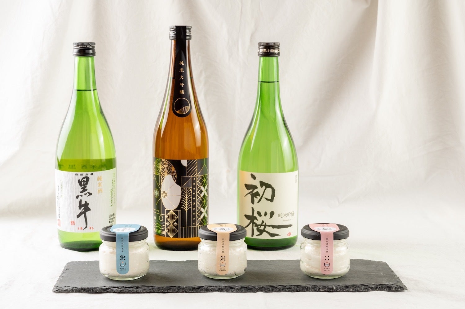 この取り組みに賛同いただき、酒粕の協力をいただいたのが海南市の「名手酒造店」さん、かつらぎ町の「初桜酒造」さん、岩出市の「吉村秀雄商店」さんでした。3つの蔵が協力してくれ、それぞれの造る「黒牛」「初桜」「車坂」の酒粕でケーキを試作。できたチーズケーキは、それぞれの酒の特徴をそのまま残し、それぞれの風味、味、食感がダイレクトに楽しめるものになりました。