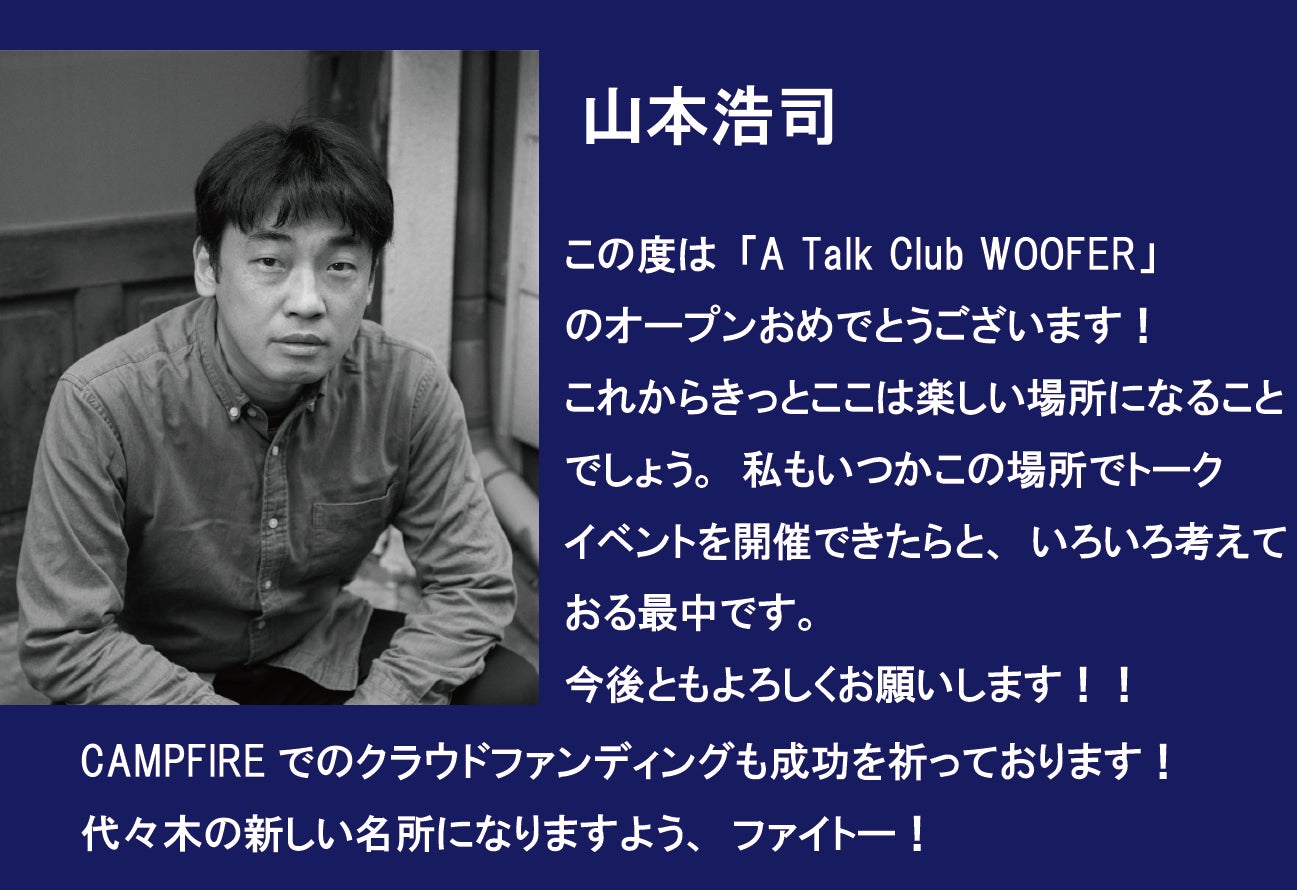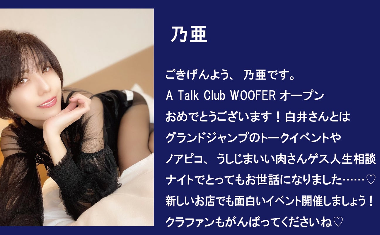 A Talk Club WOOFERを盛り上げてくれた出演者が羽ばたいて人気者になり、毎日テレビやラジオ、ネットなどで活躍している。そんな未来を楽しみにしています。また仕事が忙しかったり、ネガティブな事があったり、ご来場いただく皆さんもそれぞれ大変な日々だと思います。そんな時にこそイベントで、ランチで、昼飲みで、BARで、それぞれの時間を楽しんでもらい、A Talk Club WOOFERがお客さんを少しでも笑顔の未来へ連れて行ければ最高です。