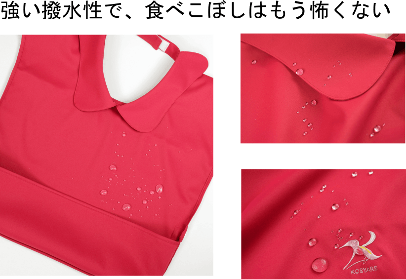 強い撥水性で、食べこぼしも洗顔時の水ぬれも怖くない!