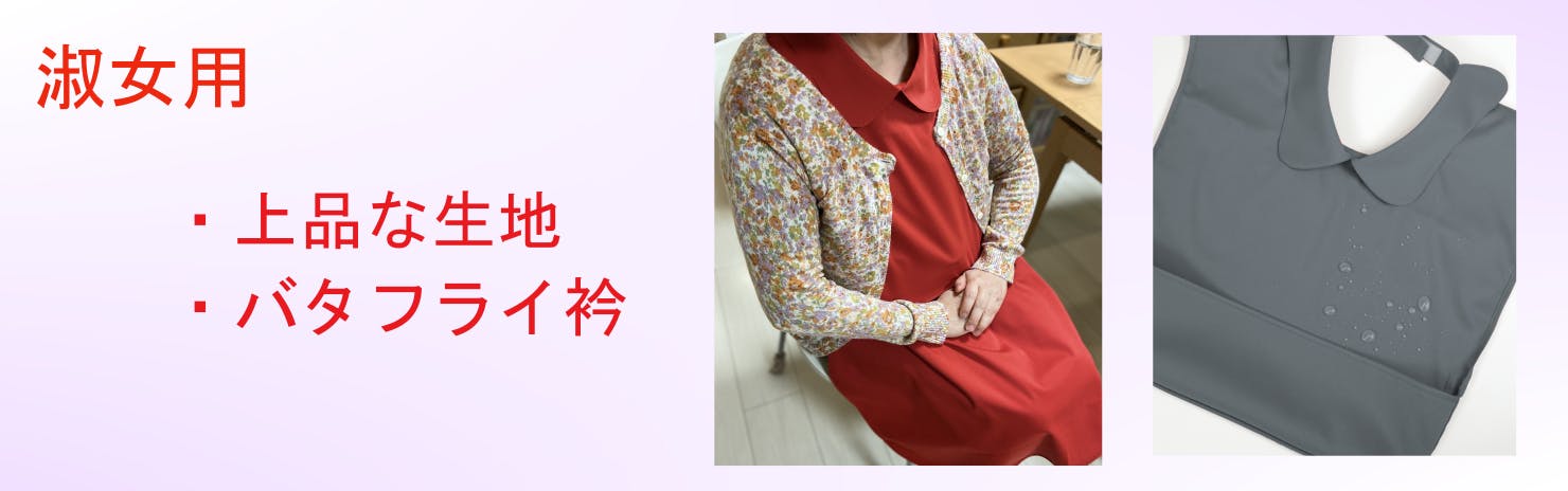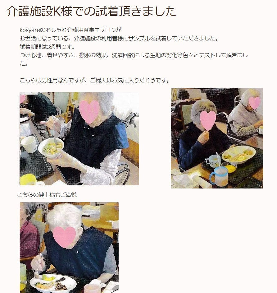 知り合いの方が経営する介護施設で、施設長の方から、市販品の介護用食事エプロンは毎回の食事で利用するものなのに、食べこぼしを防止する機能性ばかり重視し、幼児が使用するようなスタイルだったり、デザイン性に乏しいものがほとんどで、利用者の尊厳を守られているとは言えないものが多いことを聞きました。