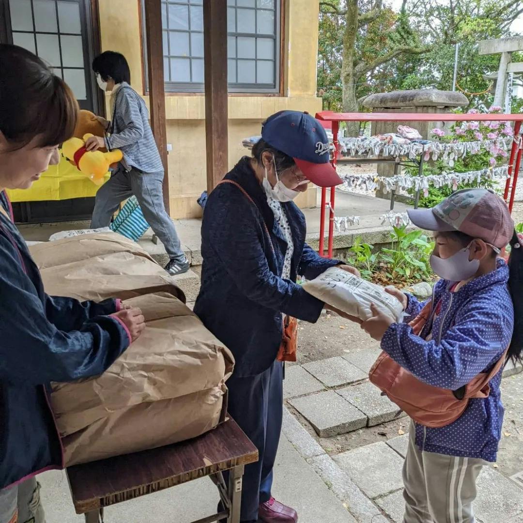 お米配布フードパントリーを開催し、ちょうど頂き物のタケノコがありましたので、タケノコご飯と野菜味噌汁をふるまいで出させていただき、たくさんのお米を配ることができました。
