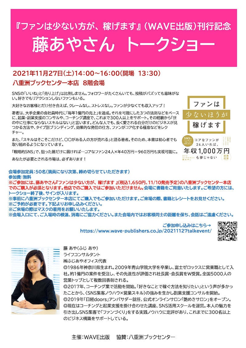 ※ご参加には、藤あや著書『ファンは少ない方が稼げます』(税込1,650円)の八重洲ブックセンター本店でのご購入が必須となります。他店でのご購入ではご参加いただけませんのでご注意ください。当日ご購入いただく形で大丈夫です。