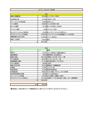 2017/12/16 17:26先日開催しました「りくごう a GO-GO!」の収支報告をさせていただきます。みなさまのご支援と、たくさんの方の協力のもとに実現することができました。 委員会メンバーだけでは叶わなかったこと。あらためて感謝と御礼を申し上げます。 また、次回にご期待ください! 旧六郷小学校みらいづくり準備委員会 もっと見るご支援ありがとうございました!!