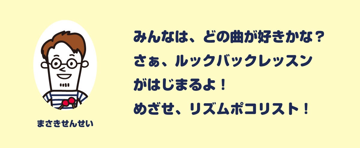 2022年は、まさき先生と一緒に「ルック・バックレッスン(復習)」が始まります。お友達の演奏を見たり、お友達へのアドバイスを参考にすることで上達のヒントを見つけられます。さぁ、一緒にリズムポコリストをめざしましょう!